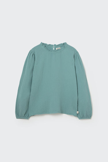 Made from soft, pleasant, textured cotton fabric, this girls' blouse combines comfort with thoughtful detail. The sustainable cotton provides a breathable feel, ideal for daily wear. It features a double stand-up collar with ruffle trim and delicate lace detailing for a refined finish. The teardrop closure at the back allows for easy dressing, while long sleeves with elasticized cuffs add practicality to the design.