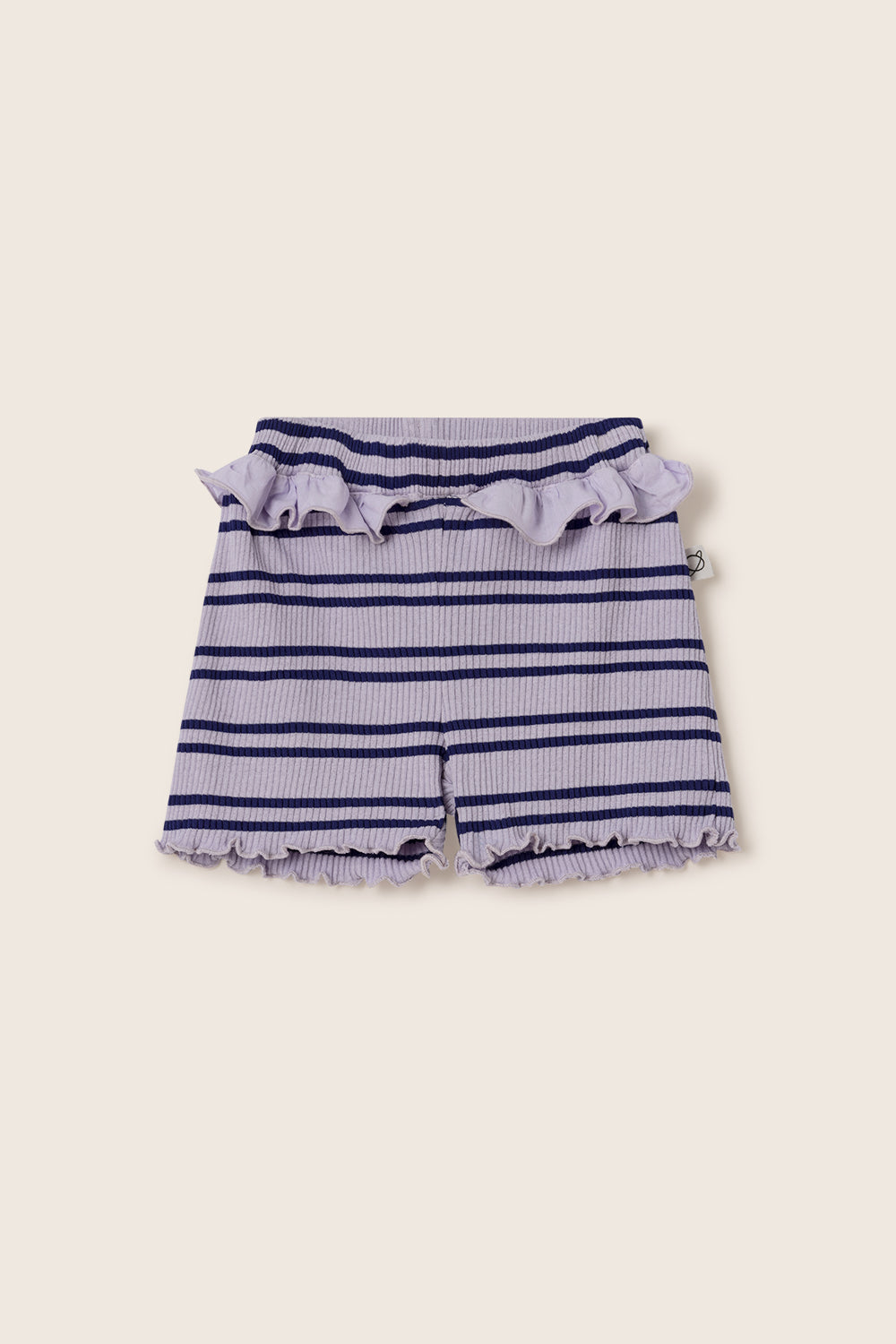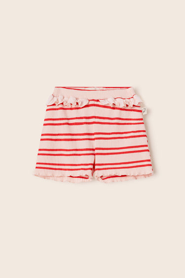 Baby girls’ striped shorts in comfortable, stretchy ribbed cotton. They feature an elastic waistband with ruffle detailing, lettuce-edge hems, and a legging-style fit for everyday comfort.