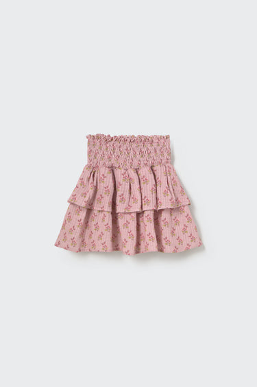 Double-layered skirt for girls made from sustainable textured cotton featuring a delicate floral print. The smocked waistband offers a comfortable and flexible fit. Soft, breathable, and eco-friendly.