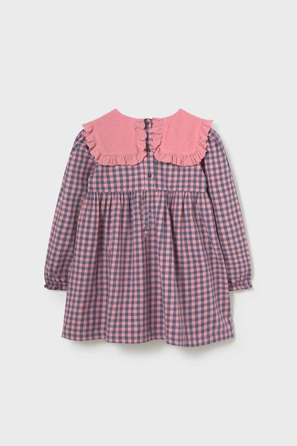 This girls’ dress is made from soft, brushed flannel in a classic gingham plaid pattern, crafted from 100% sustainable cotton. It features a squared Peter Pan collar with a ruffled lace trim in contrasting textured fabric. The gathered upper side adds volume, and elasticized ruffled cuffs provide a comfortable fit. Buttons at the back allow easy dressing. Warm and smooth to the touch, ideal for cooler days.
