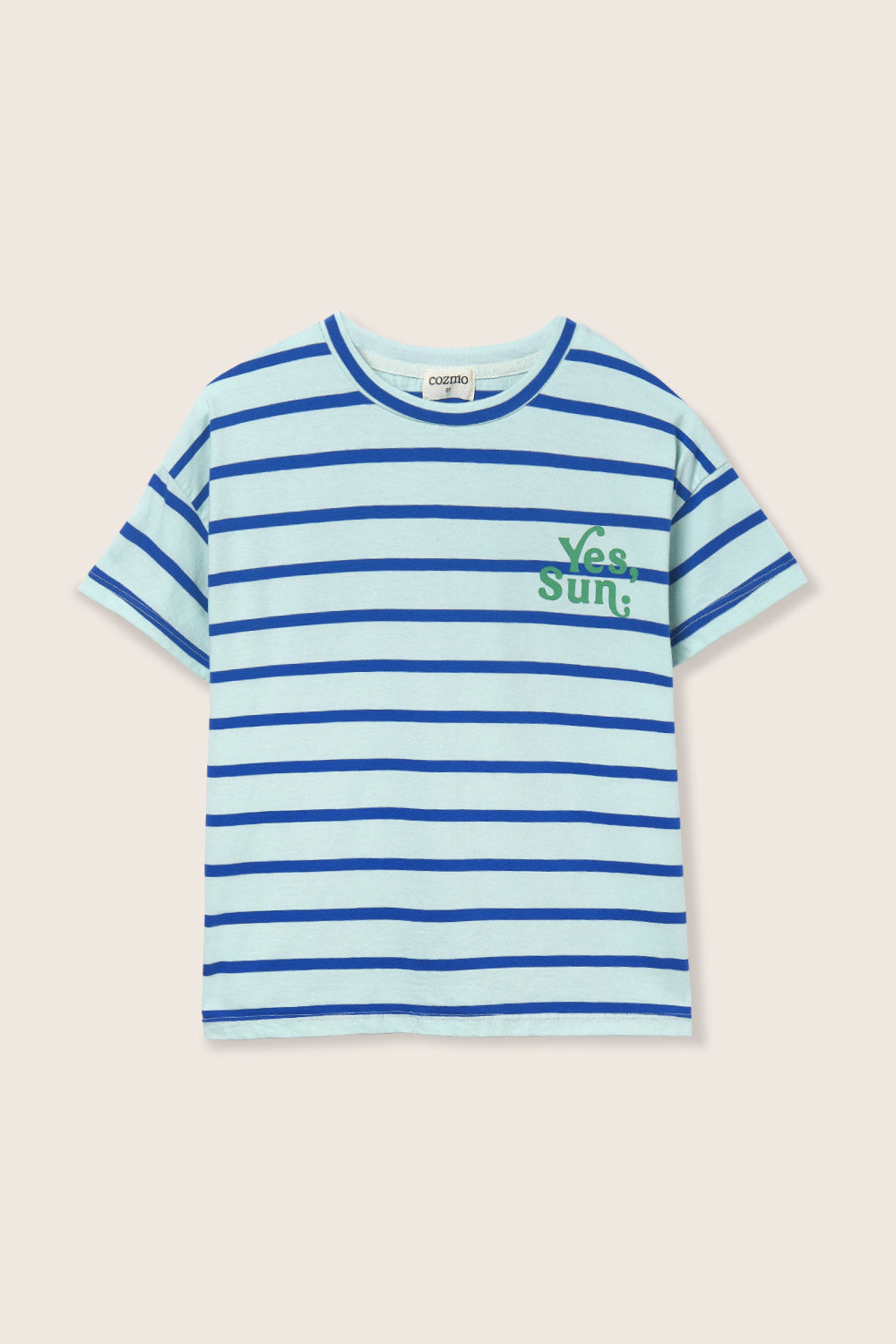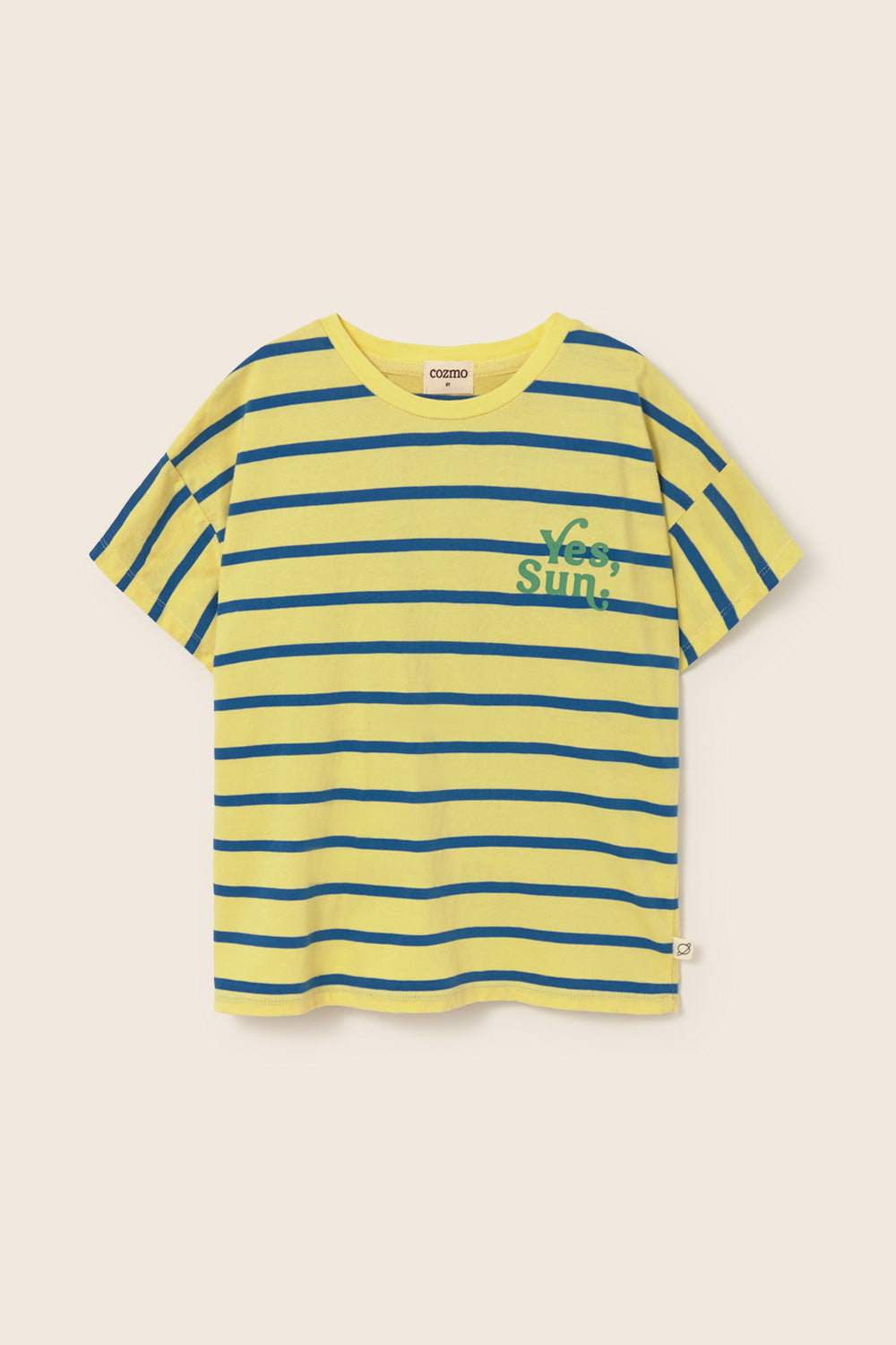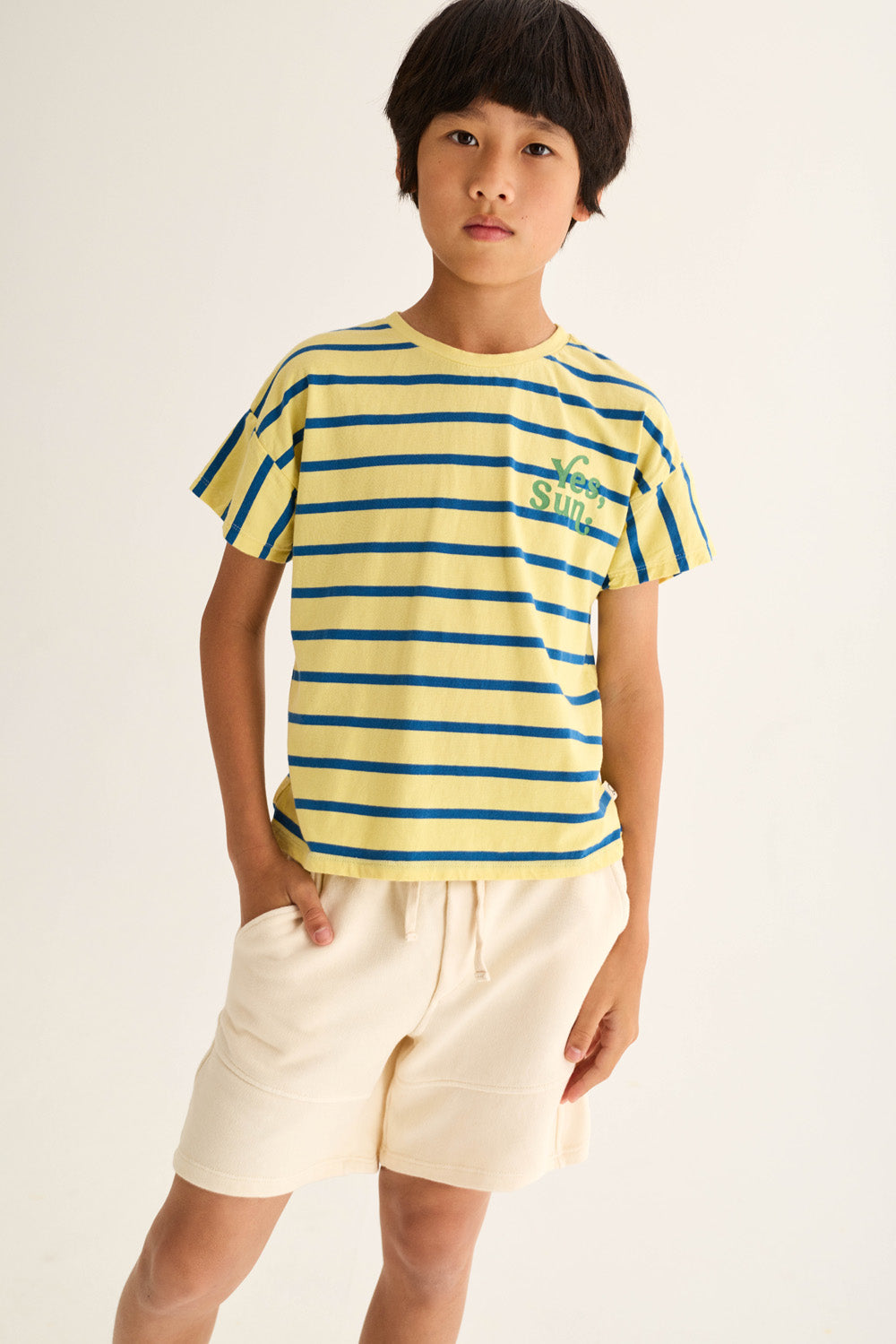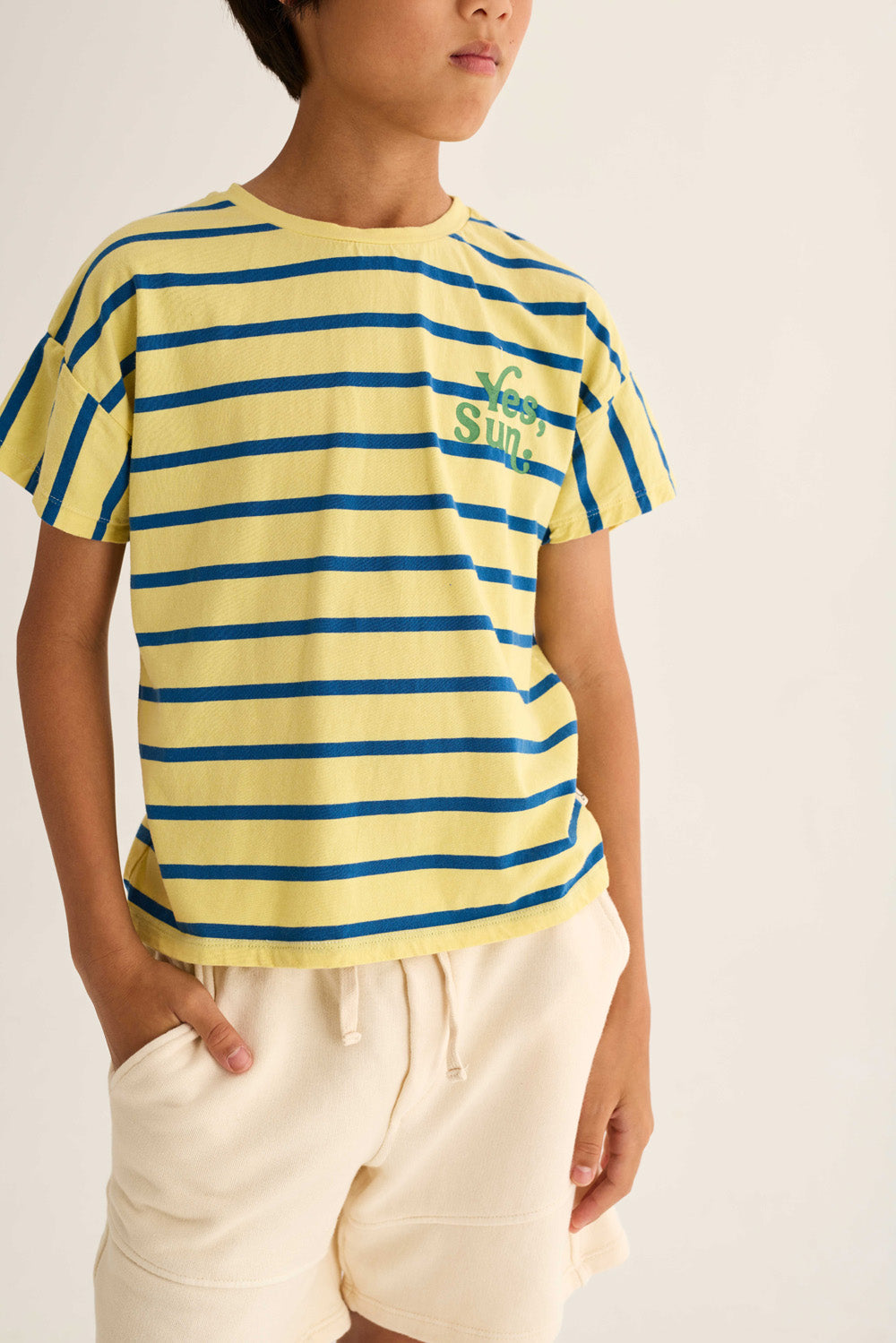 Kids’ striped T-shirt made from smooth, breathable jersey cotton. It features a round neckline in a solid color, dropped shoulders with short sleeves, and a printed motif with the message “Yes, Sun.” on the chest for a casual look.