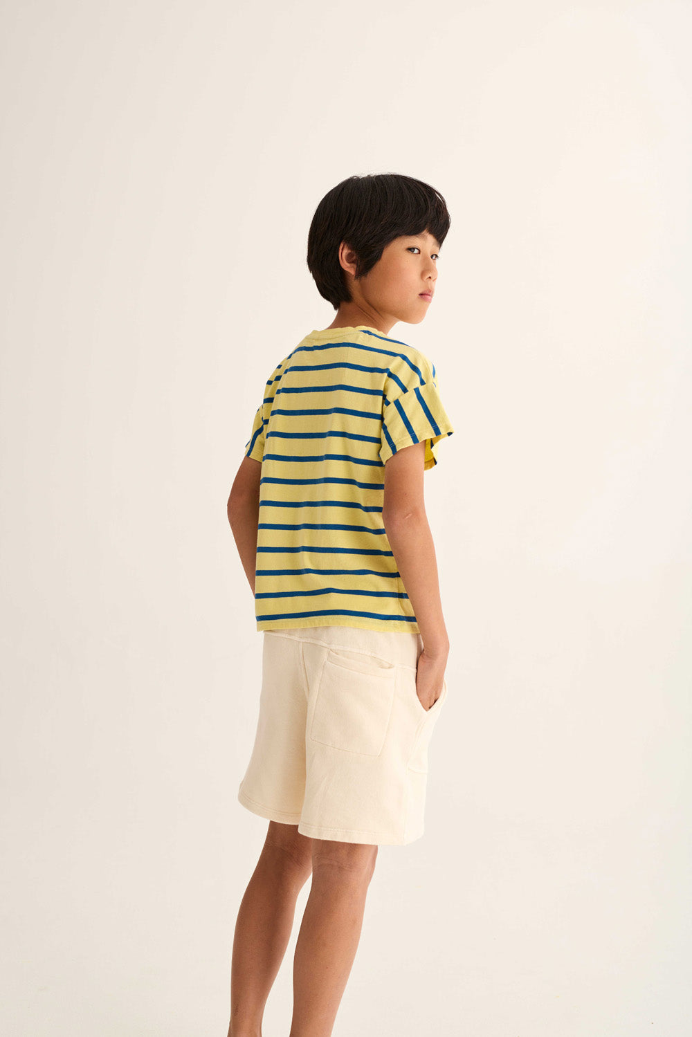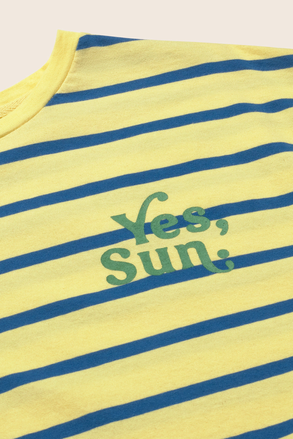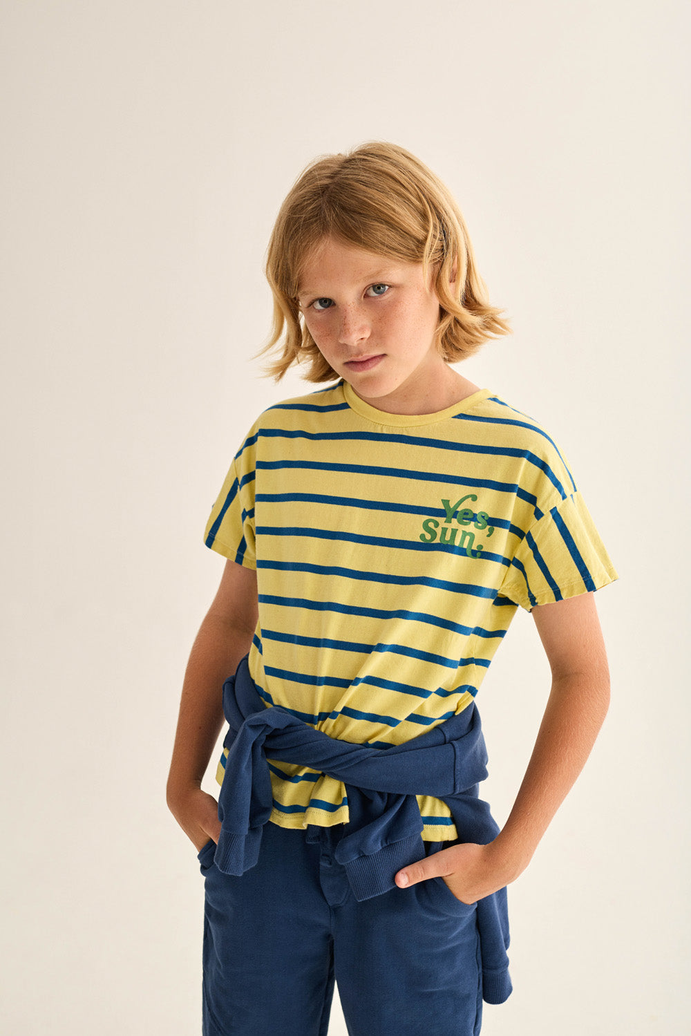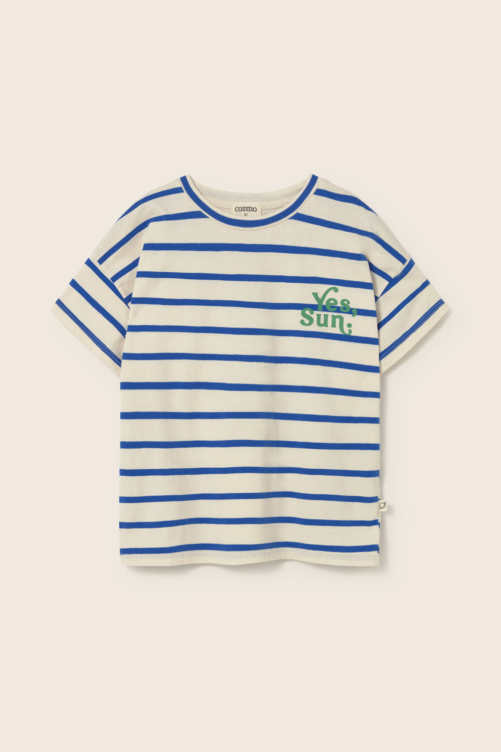 Kids’ striped T-shirt made from smooth, breathable jersey cotton. It features a round neckline in a solid color, dropped shoulders with short sleeves, and a printed motif with the message “Yes, Sun.” on the chest for a casual look.