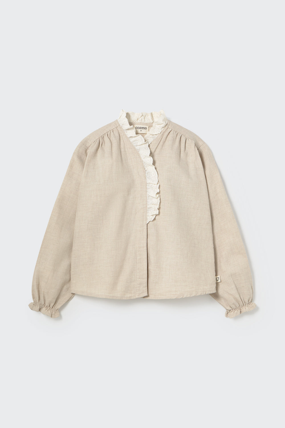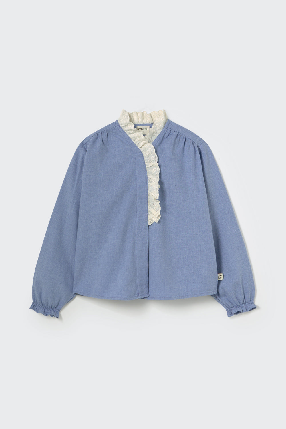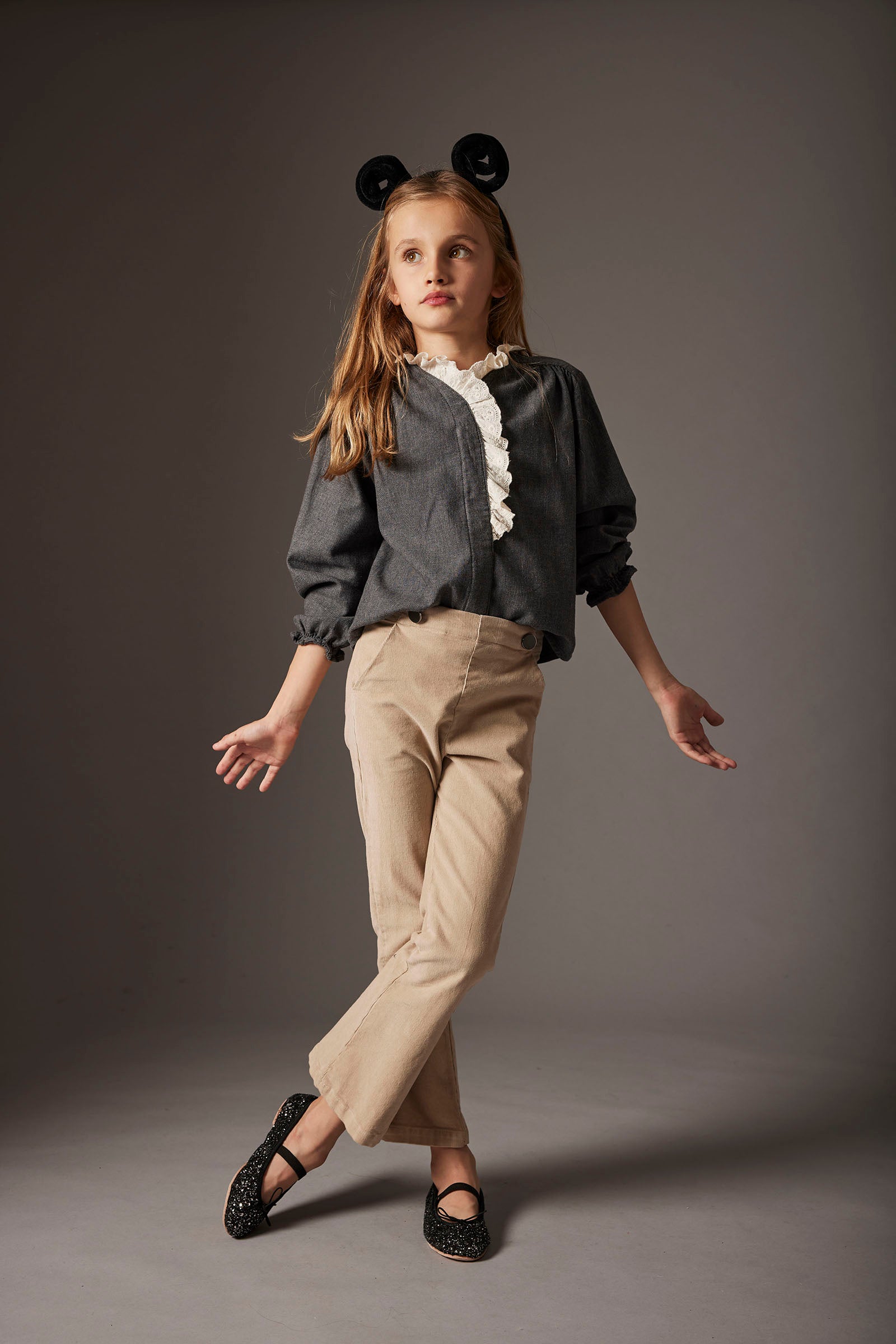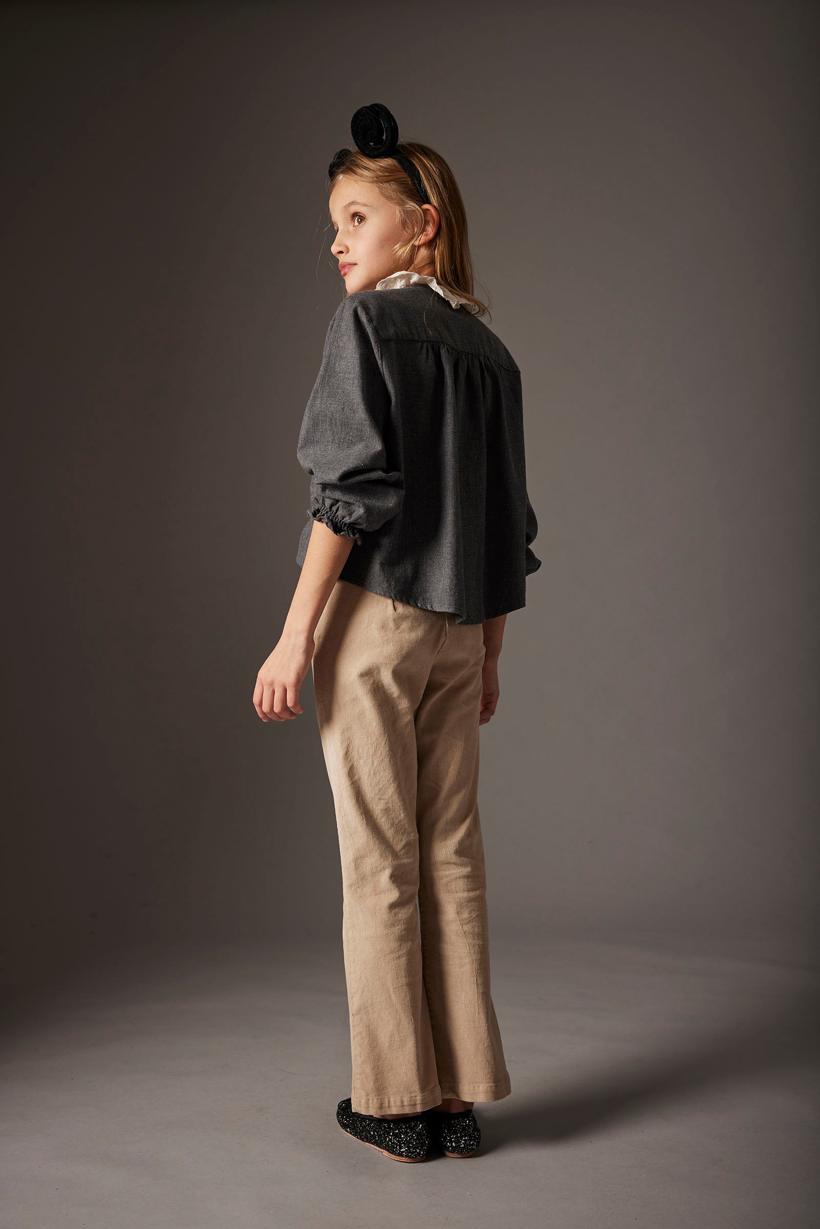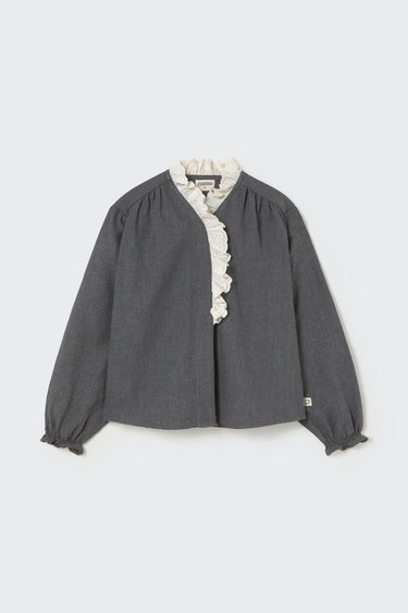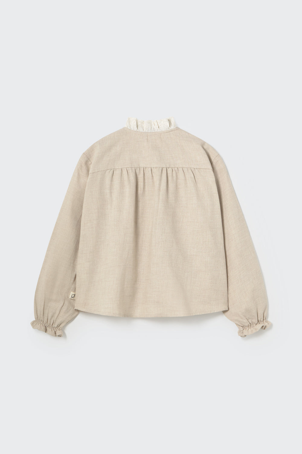 This girls’ blouse is made from soft cotton flannel with a subtle mélange effect, crafted from 100% sustainable cotton. It features lace trim along the neckline and front closure, with concealed buttons on the inside for a clean finish. Designed with slightly forward shoulder seams, long sleeves with elasticized cuffs, and a delicate ruffle trim. A back yoke adds structure and comfort.