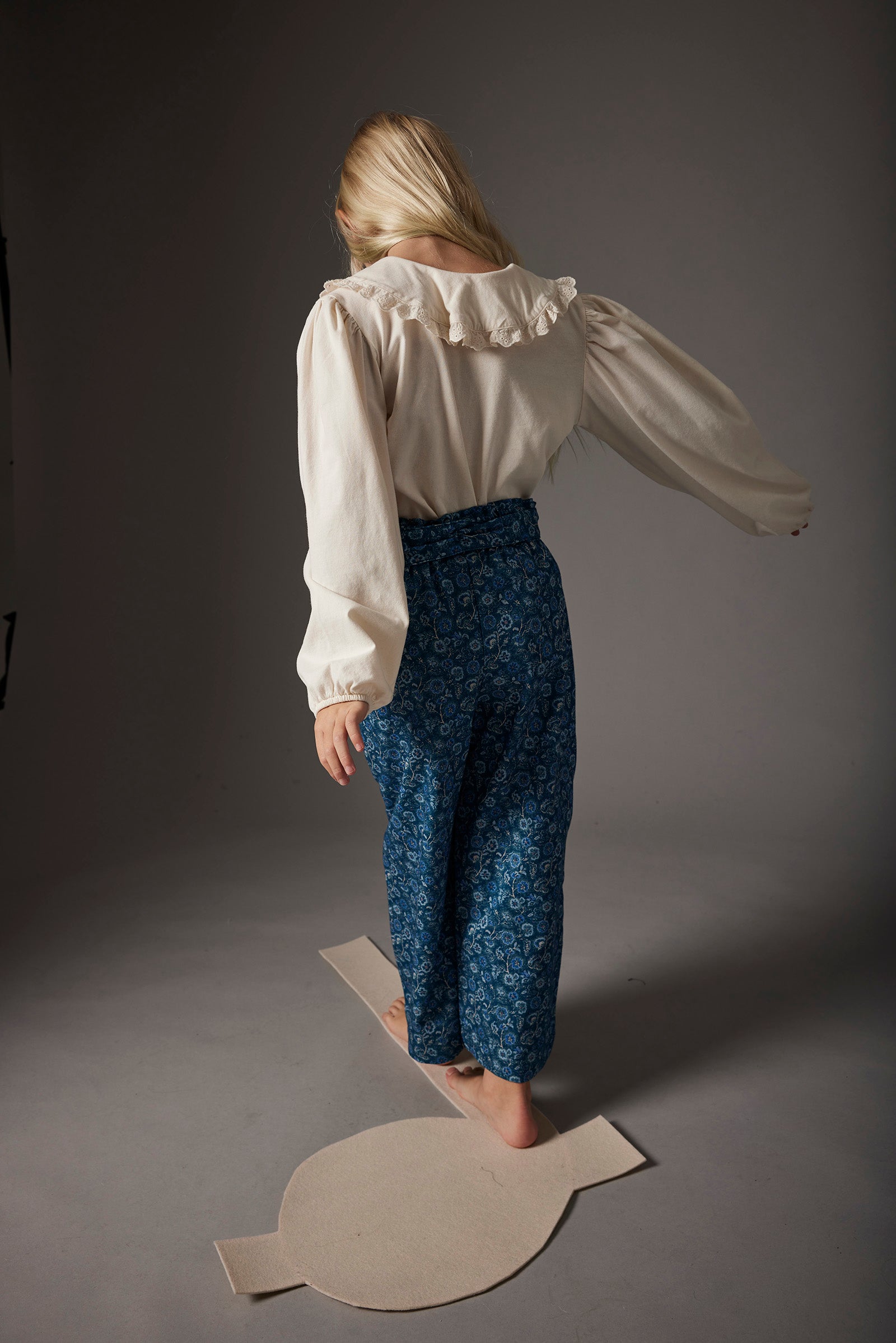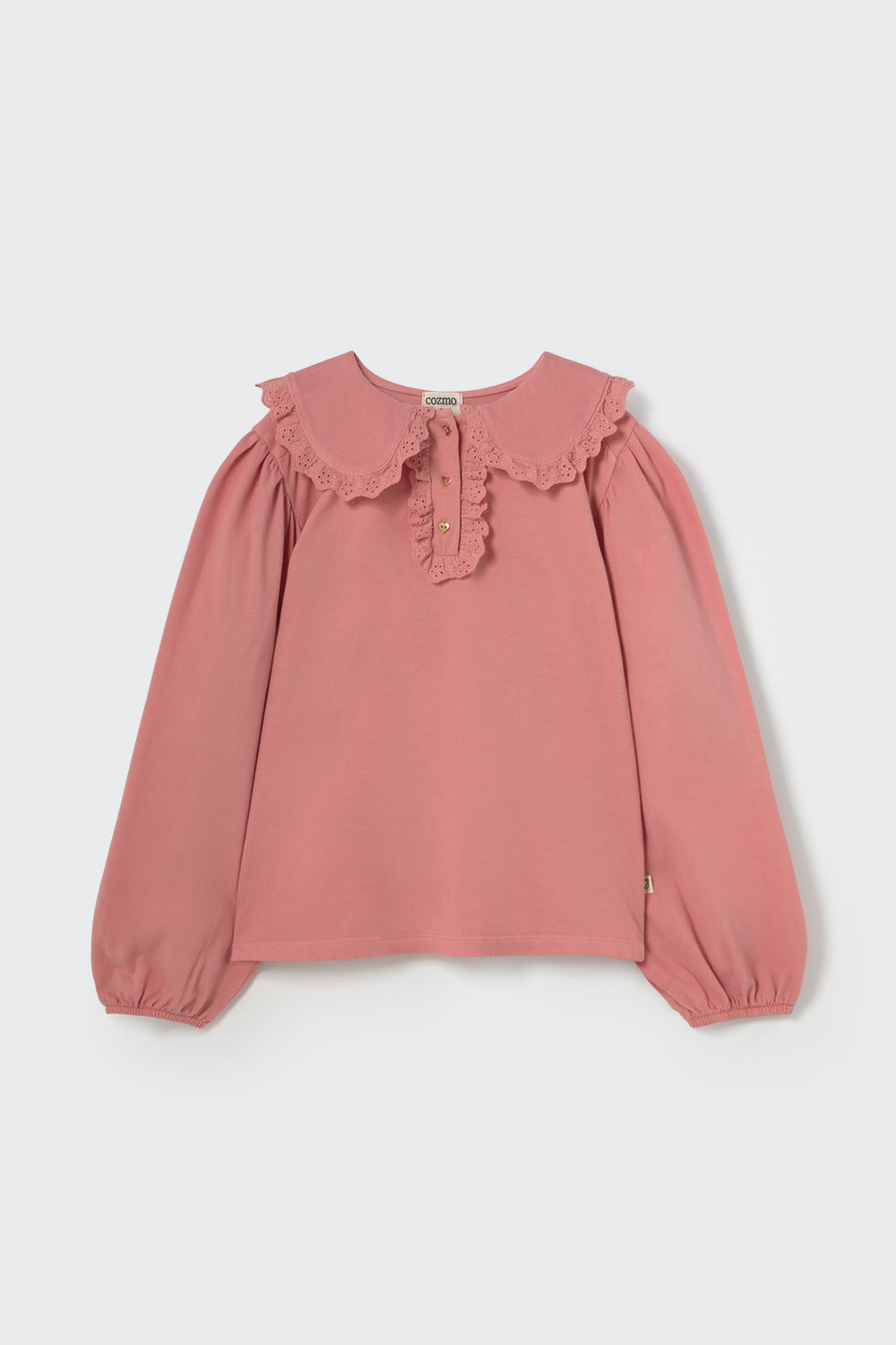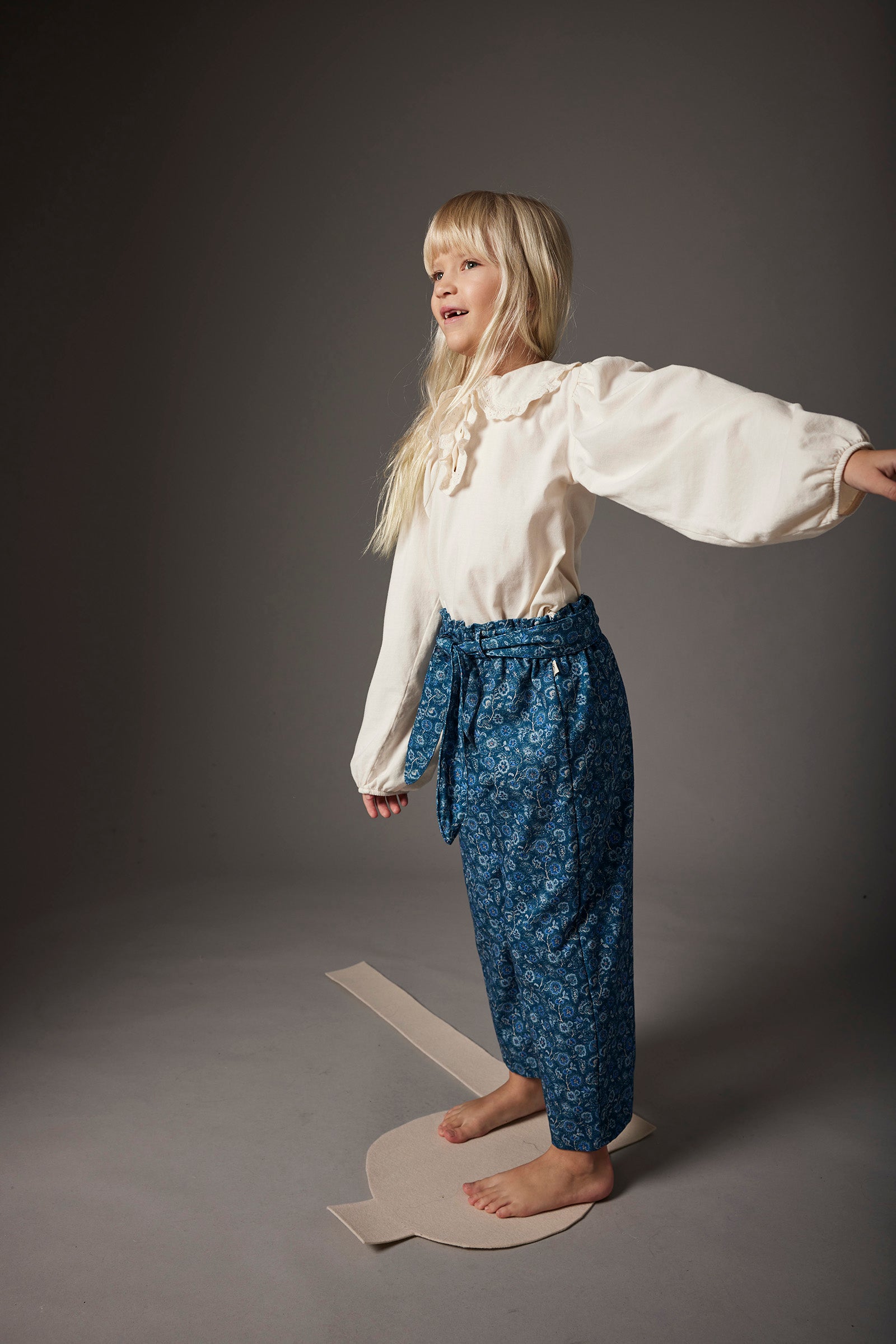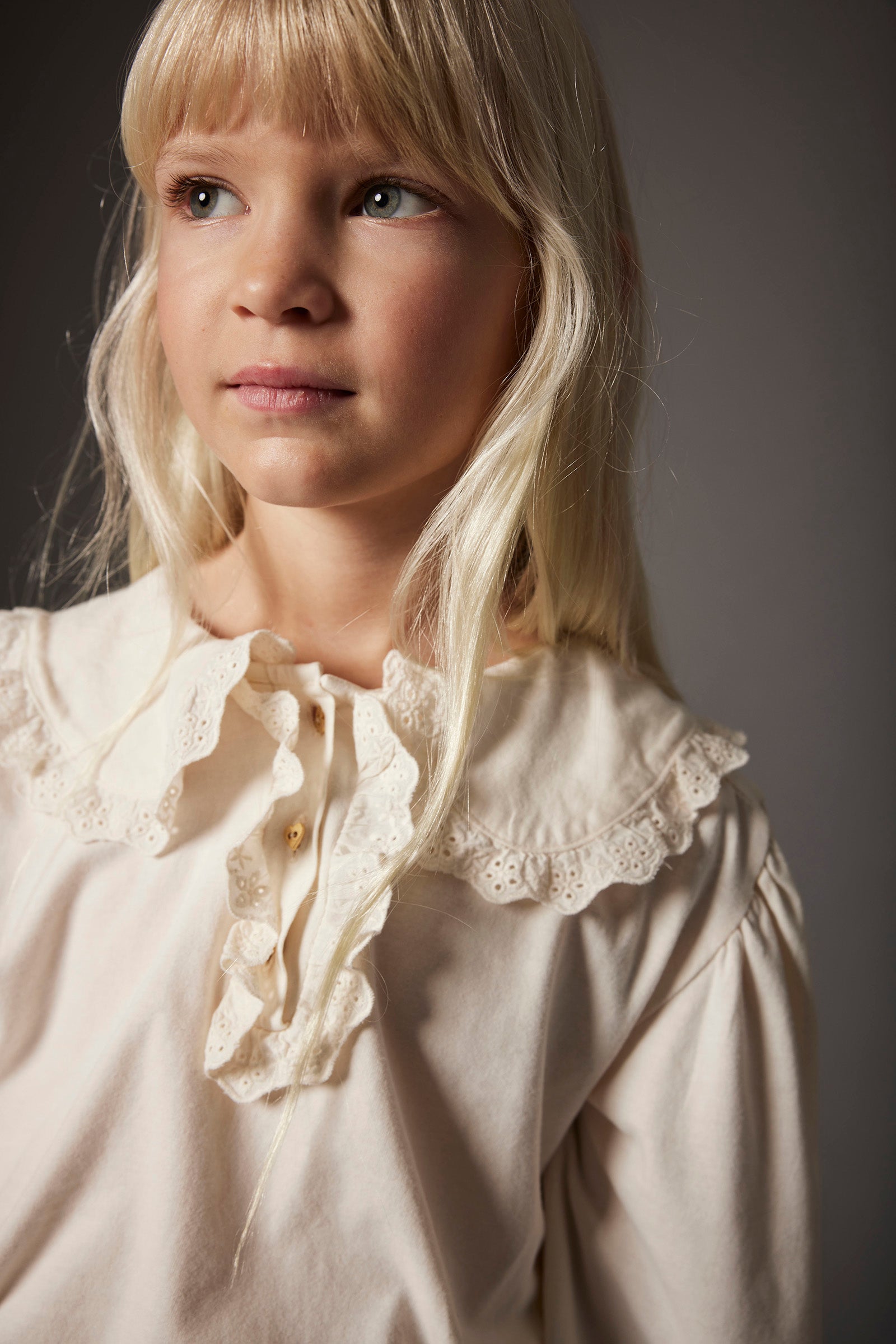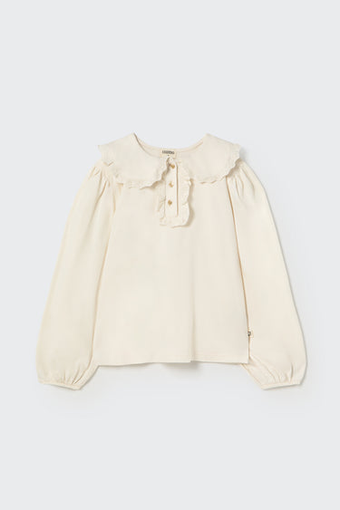 Blouse made from organic cotton jersey fabric with a brushed finish for warmth and a soft, comfortable feel. Features a Peter Pan collar and button placket detailed with a ruffled trim. Puffed sleeves with elasticized cuffs add ease of movement. Designed for girls to stay cozy and comfortable.