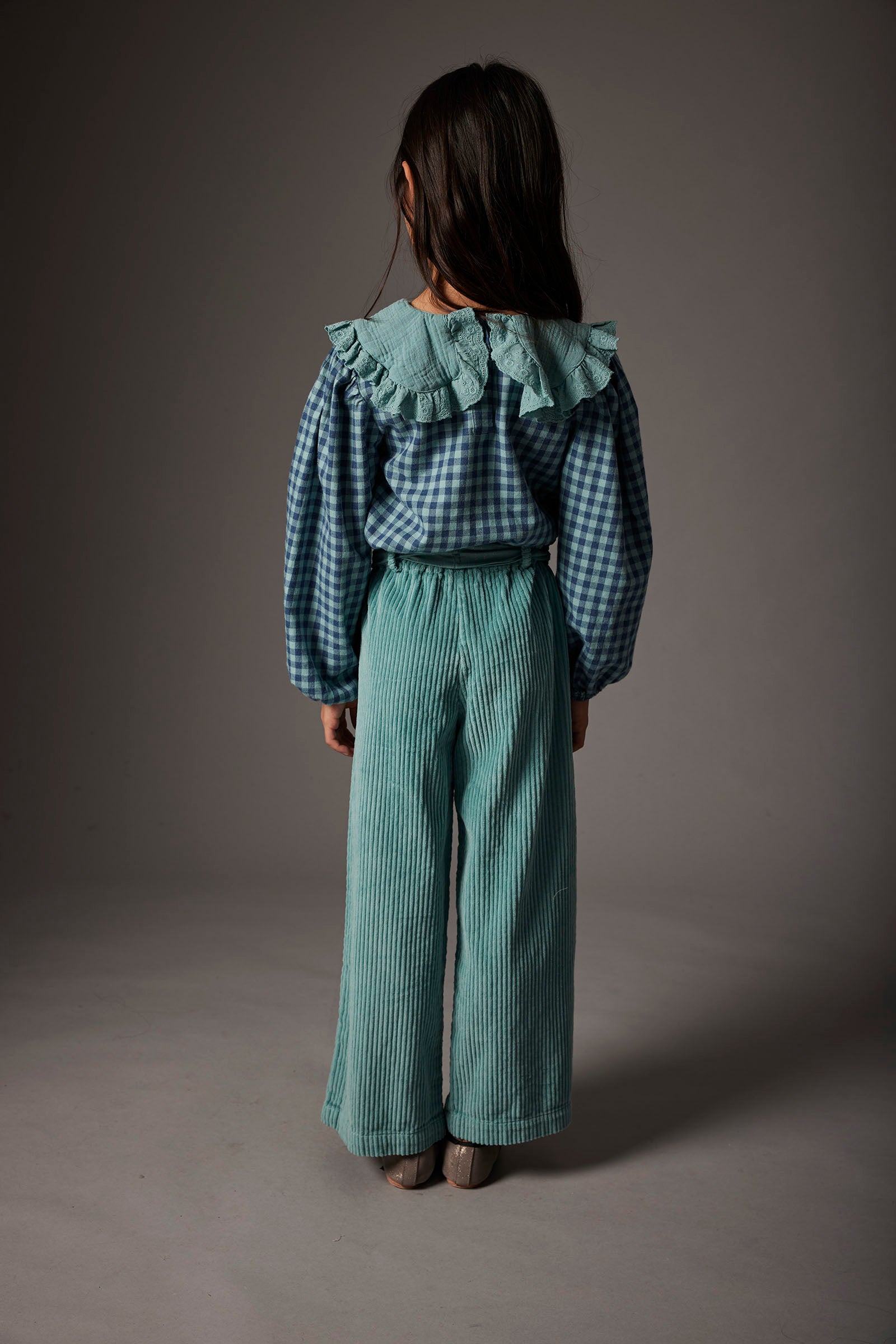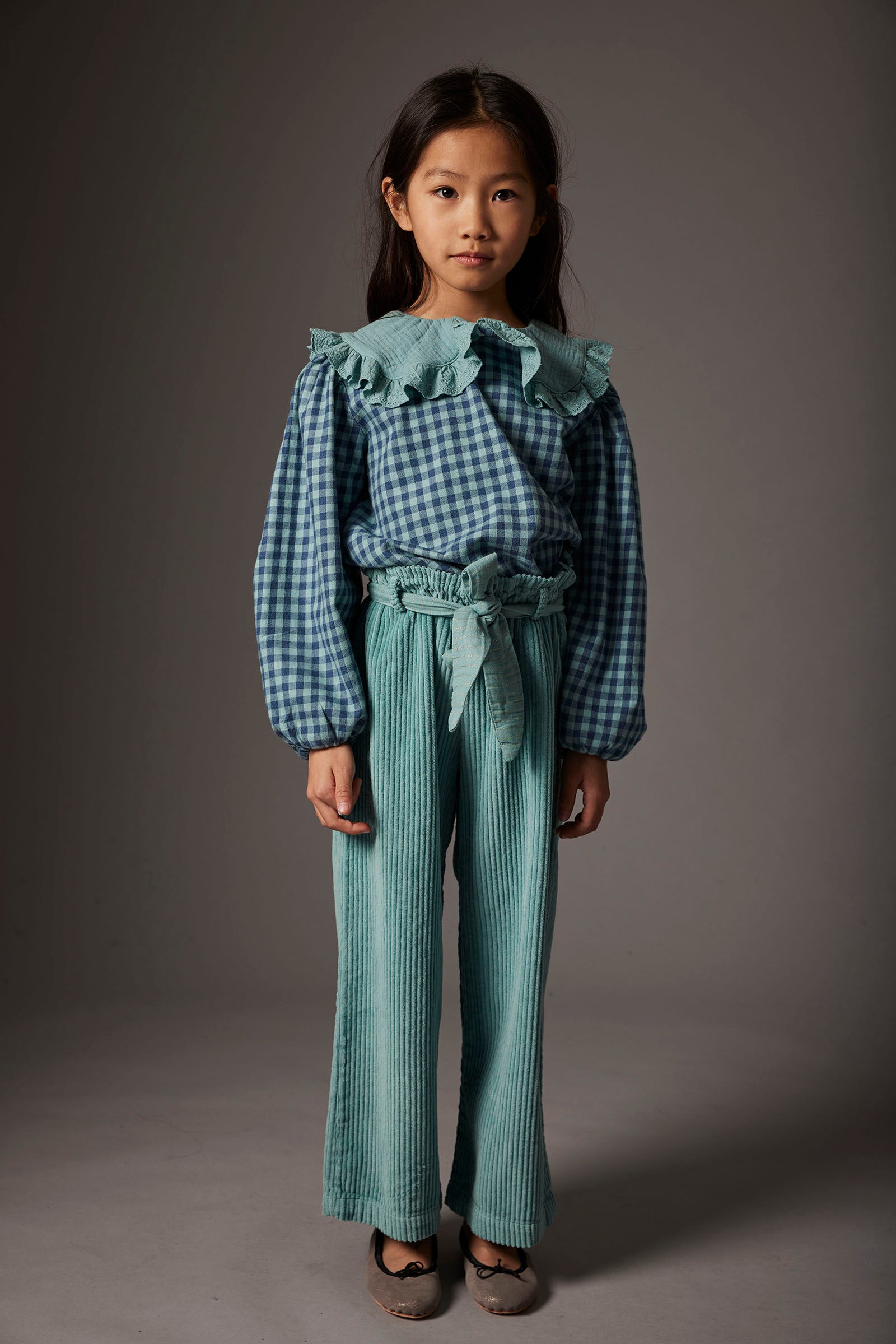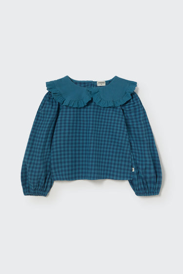 This girls’ blouse is crafted from soft, brushed flannel in a classic gingham plaid pattern, made from 100% sustainable cotton. It features a squared Peter Pan collar in contrasting textured fabric with a lace trim detail. The button-front design allows easy dressing, while puffed sleeves with elastic cuffs provide a comfortable fit. Warm and smooth to the touch, perfect for cooler days.