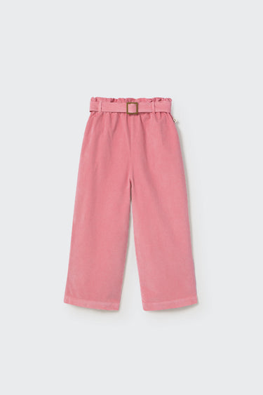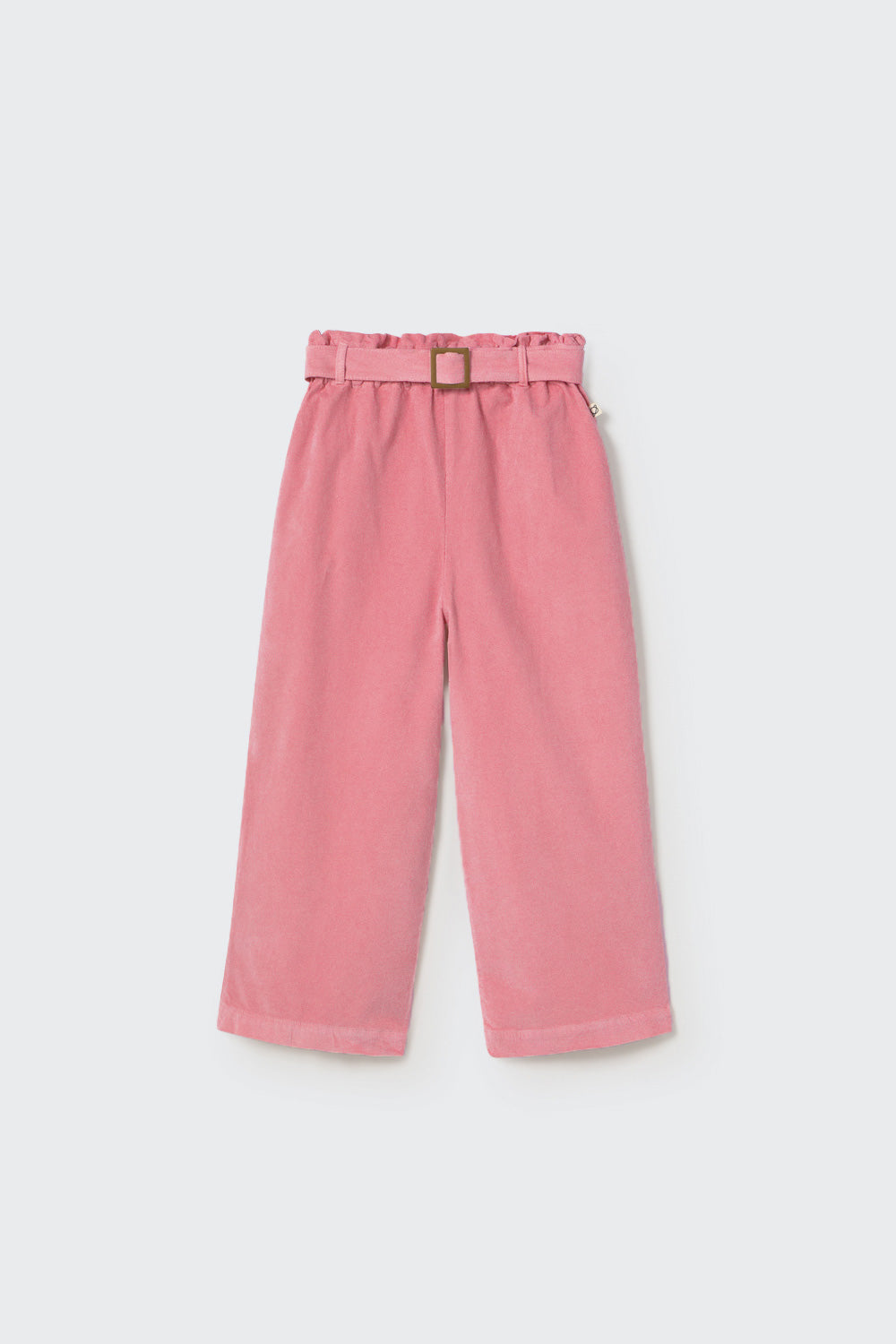 Pants crafted from stretchy, sustainable cotton velour with a soft, velvety texture. They feature an elastic waistband with belt loops and a fixed belt that ties at the front, secured by a metal buckle. The wide-leg silhouette offers a comfortable and relaxed fit. Designed for girls.