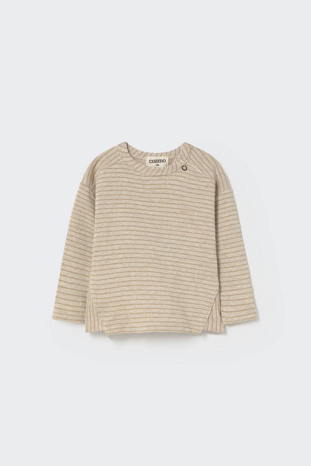 This baby striped T-shirt is made from sustainable viscose, EcoVero-certified, and stretchy fleece. It features a round neckline, dropped shoulders, and long sleeves. "Cozmo" is embroidered on the chest. Triangle inserts at the sides display vertically placed stripes. The brushed interior offers a warm, toasty feel for all-day comfort. It is also part of our recycled kids' clothes collection.
