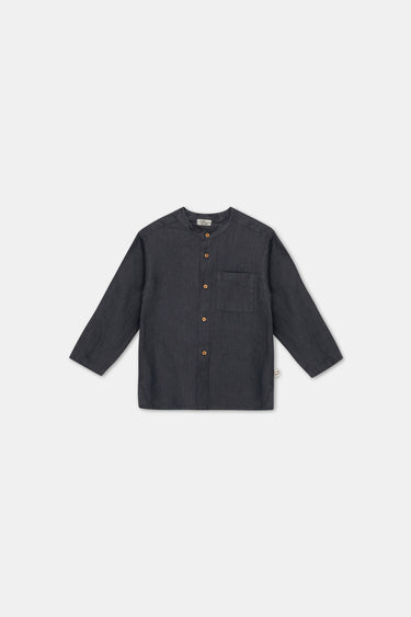 Linen shirt with a mao collar, long sleeves, a button placket at the front, side slits, and a patch pocket at the front.