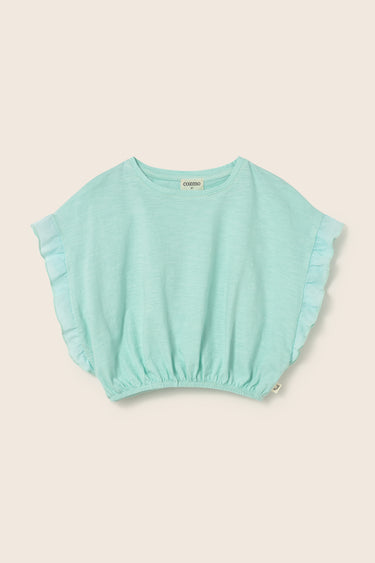Girls’ T-shirt made from very lightweight slub cotton. It features a round neckline, dropped shoulders with flutter sleeves in cotton voile, and an elasticated hem for a comfortable fit.