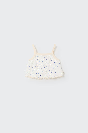 Sleeveless. Cropped. Straight neck. Ribbed straps and neckline. Lettuce-edged trims at hem. Naturally wrinkled with a tiny flower pattern.