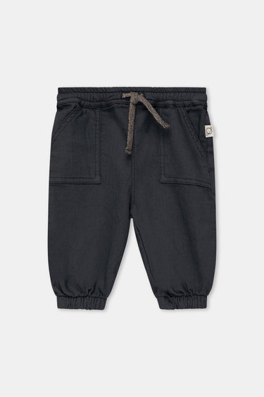 These baby pants feature an elastic waistband with an adjustable drawstring, rectangular patch pockets with diagonal openings, and elasticized hems. Available in Dark Grey, Oil and Brown.