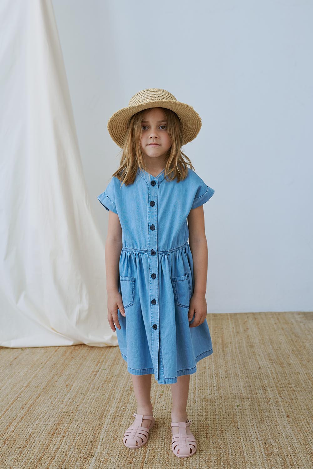 Super soft and ready to twirl. This denim dress is styled with a V-neck, a button opening at the front, an elasticized waistband, and two front patch pockets. It is woven in 100% cotton.