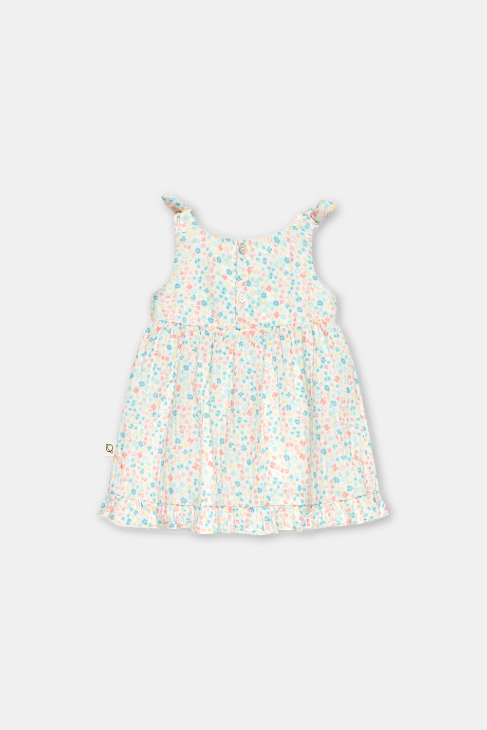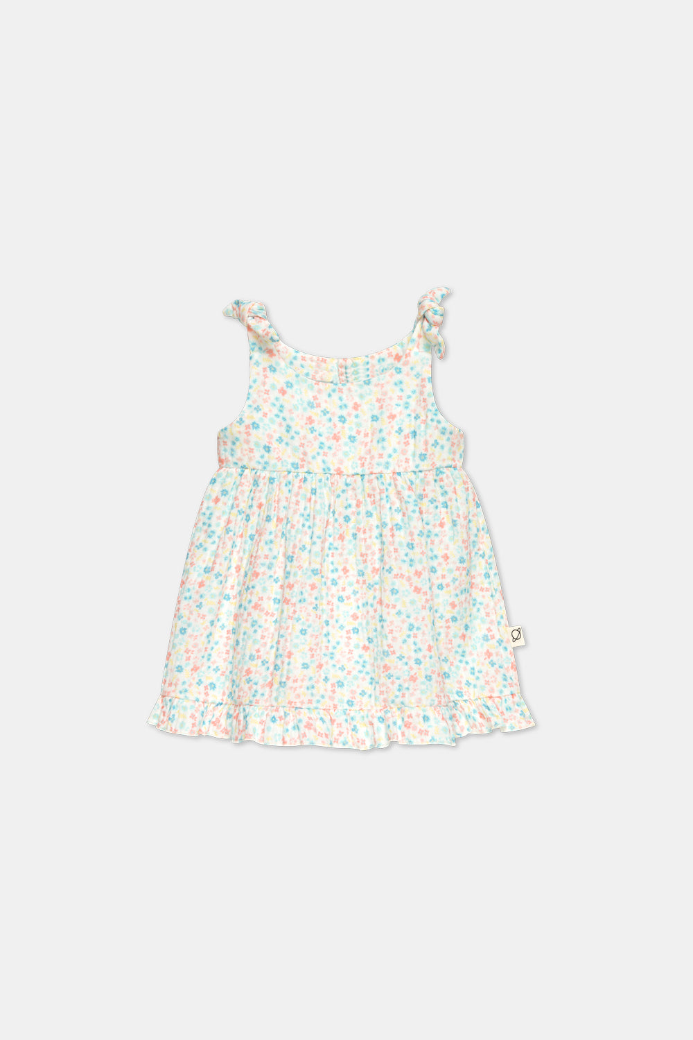 This organic guaze floral dress features a round neck, straps at the shoulder with decorative bows, and ruffle details at the hem. Buttoned at the back.