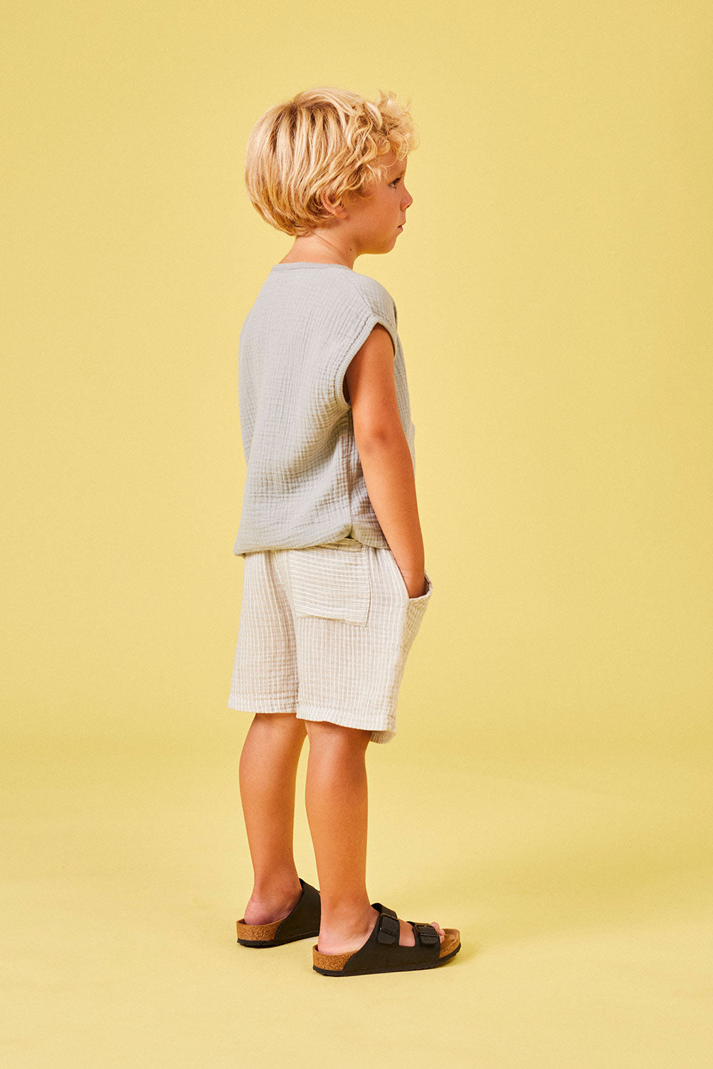 This organic gauze sleeveless top has a crew neck with a ribbed V-insert. Rib at the hem and the armholes.