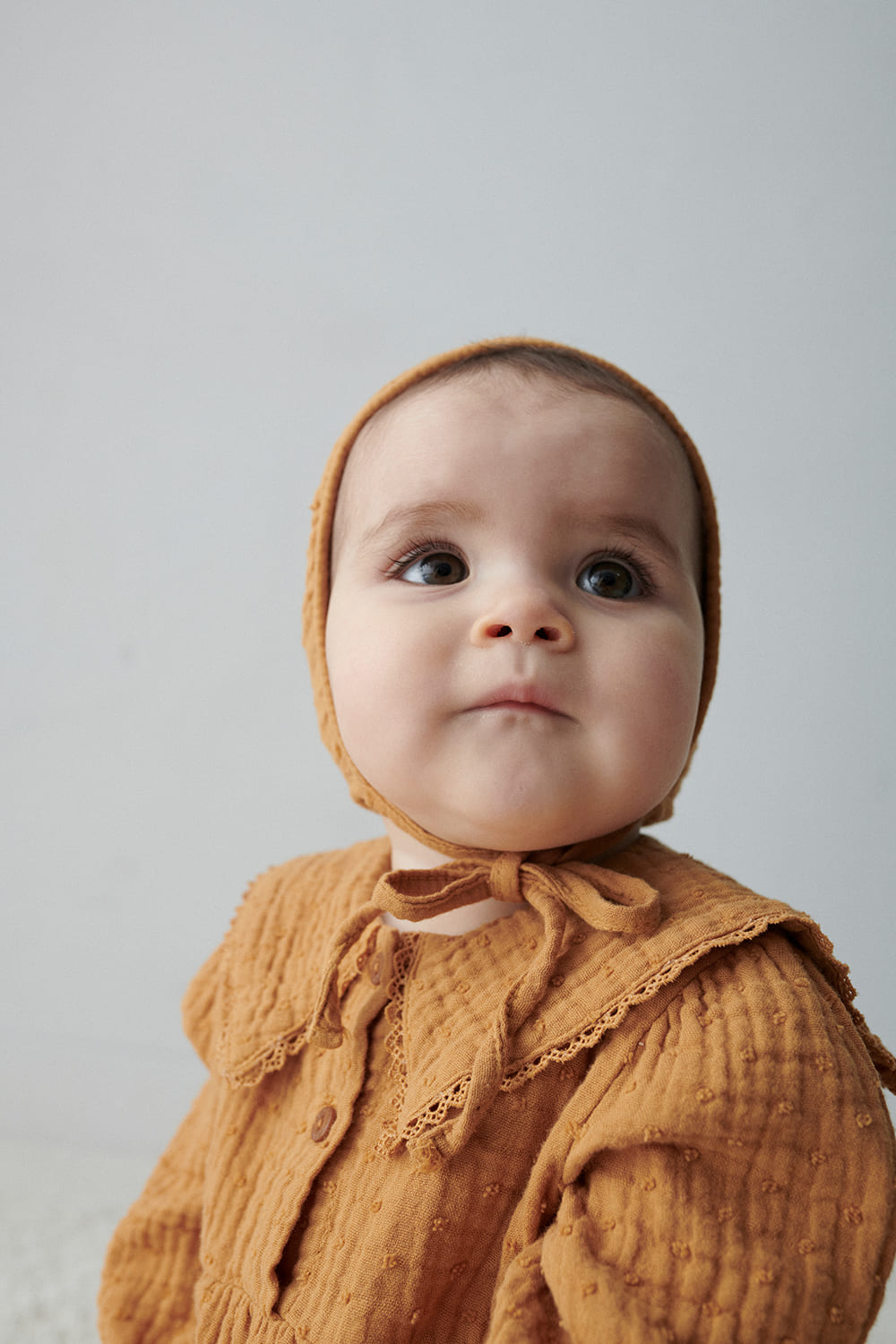 Organic gauze baby bonnet in plumeti textured. It has ribbons that tie under the chin. Certified by GOTS and OEKO-TEX this bonnet is made up of 100% organic cotton. Available in 4 colors like mustard, pink, stone and dark grey.