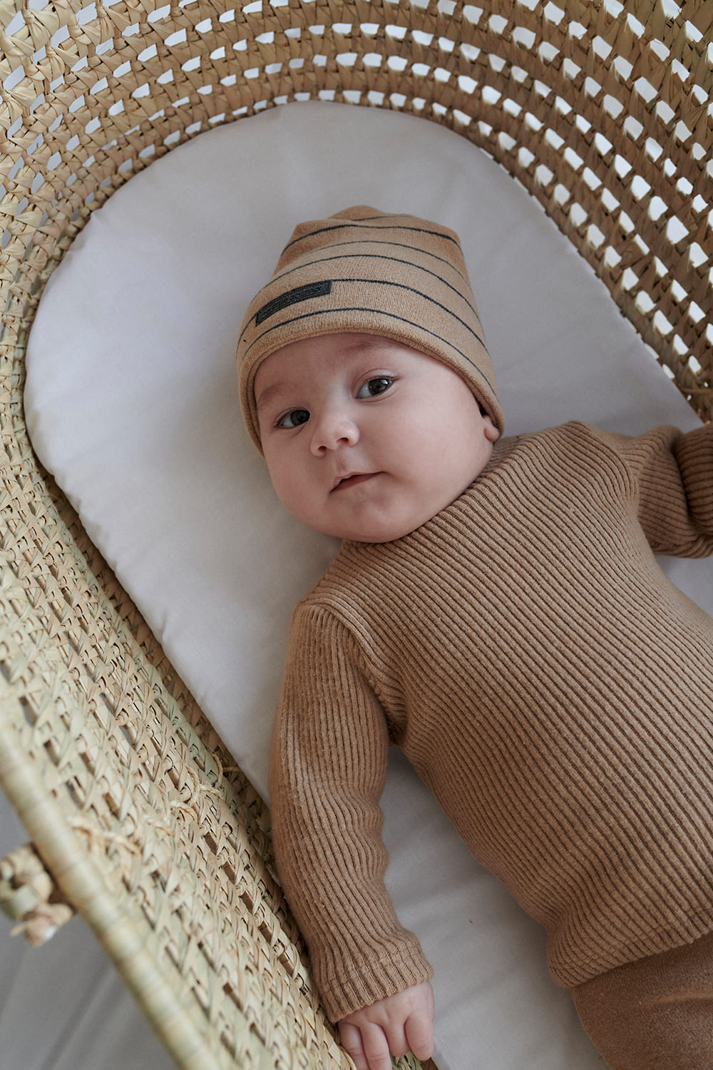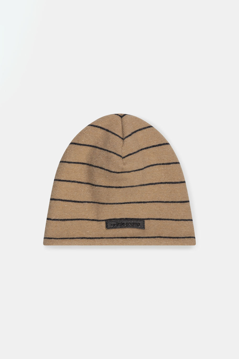 This striped baby beanie has a slouch fit, so it can be pulled down over the ears. Made of organic recycled soft stripes knit composed of 58% recycled cotton, 38% organic cotton, 4% elastane. This design is available in 2 colors, camel and dark grey.