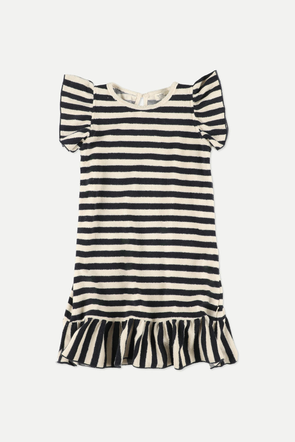 Striped dress in a super fluffy, comfy, organic cotton towel fabric. Round neckline, keyhole closure at the back, and flutter sleeves. Ruffle details at hem. Stripes in a vertical position at hem. 80% organic cotton, 20% recycled polyester. Knit