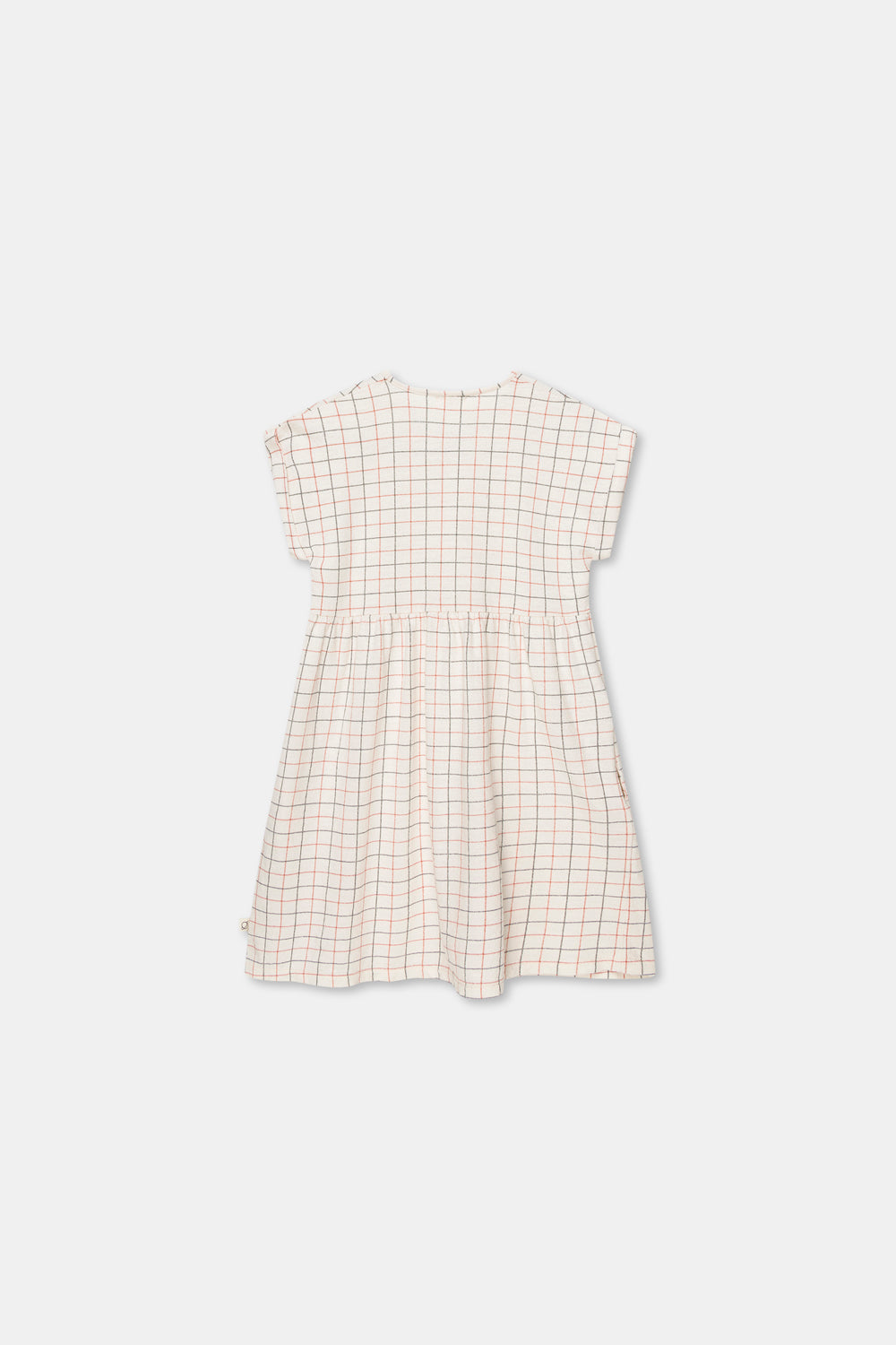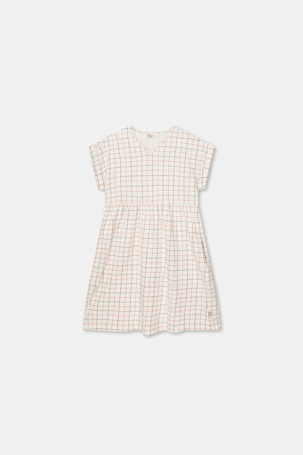 This organic crepe dress is designed with a V-neck and rolled-up short sleeves in an all-over plaid pattern. Gathered at the bust.