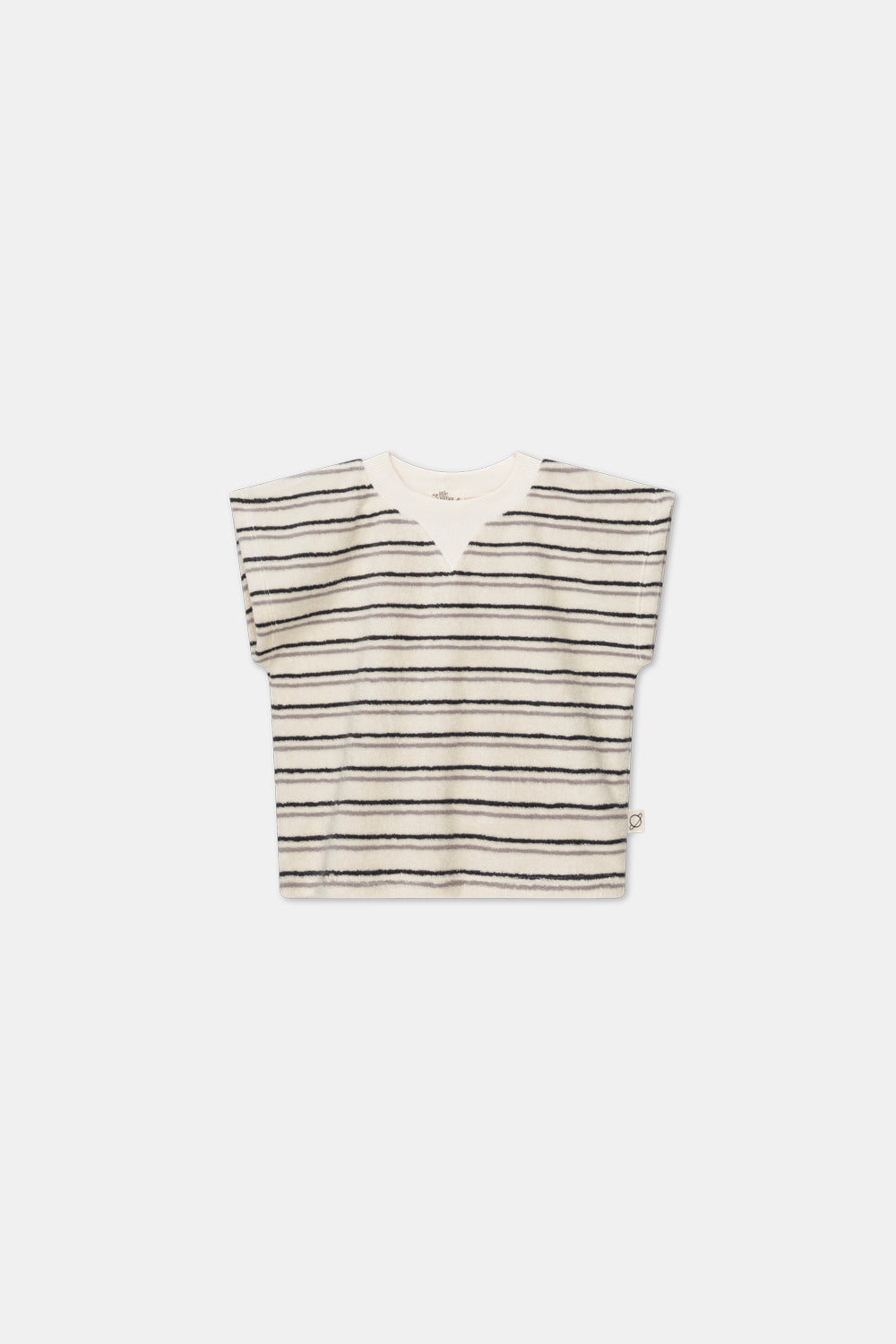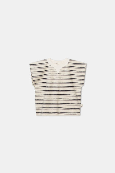 This sleeveless, striped, toweling T-shirt features dropped shoulders and a rib V-insert at the neck.