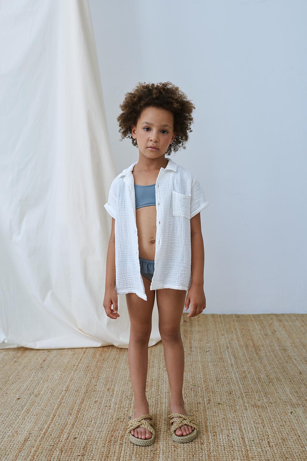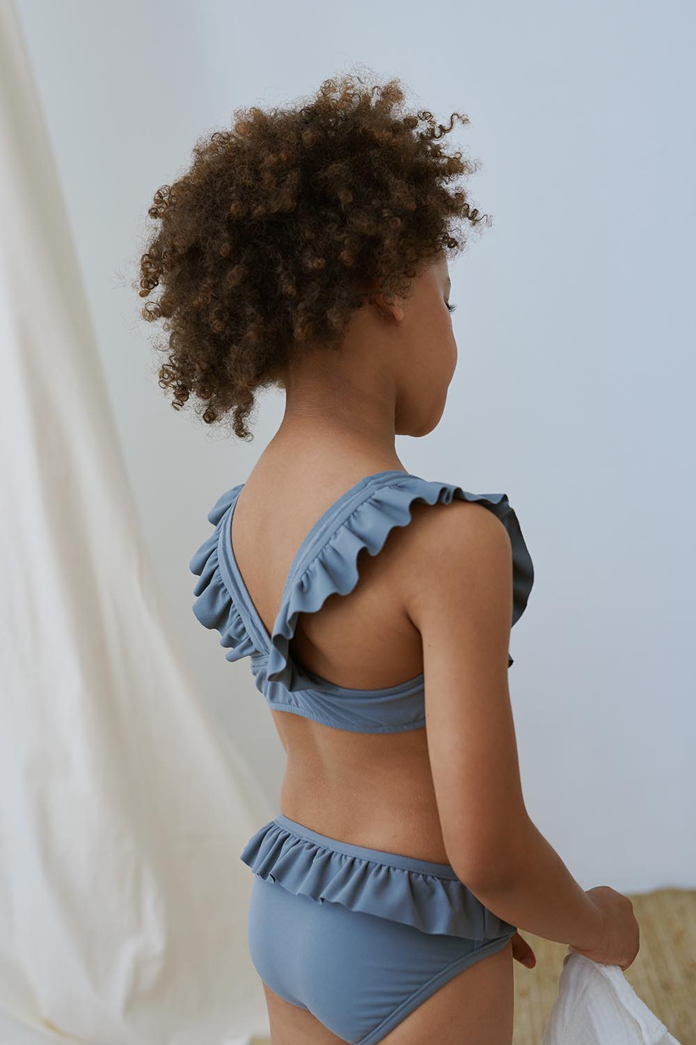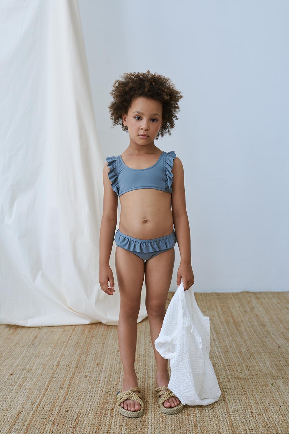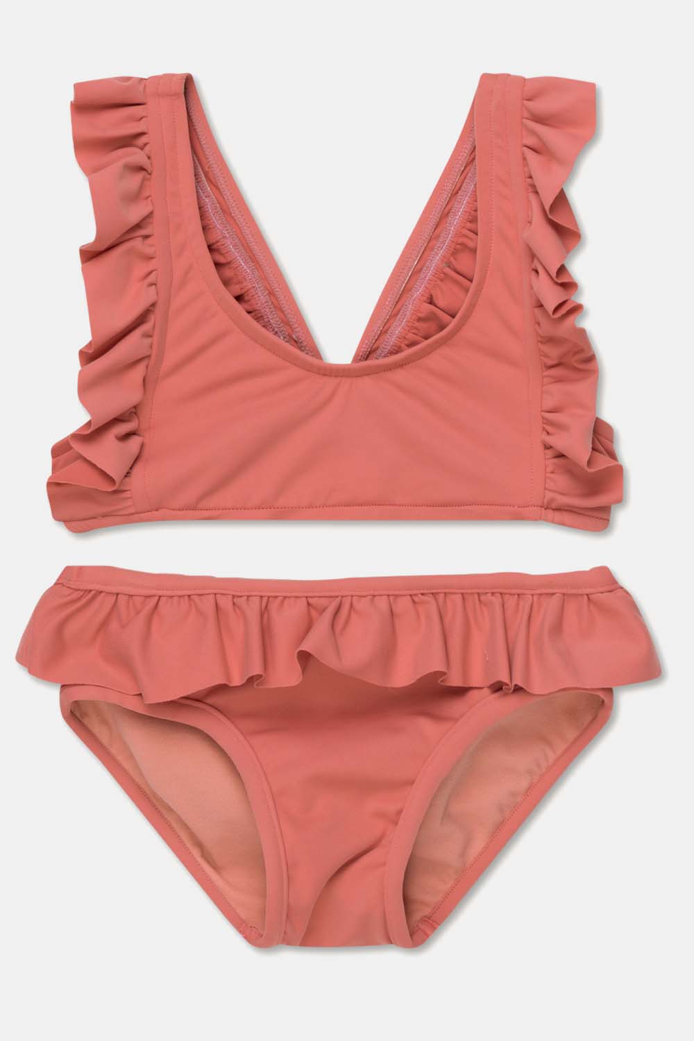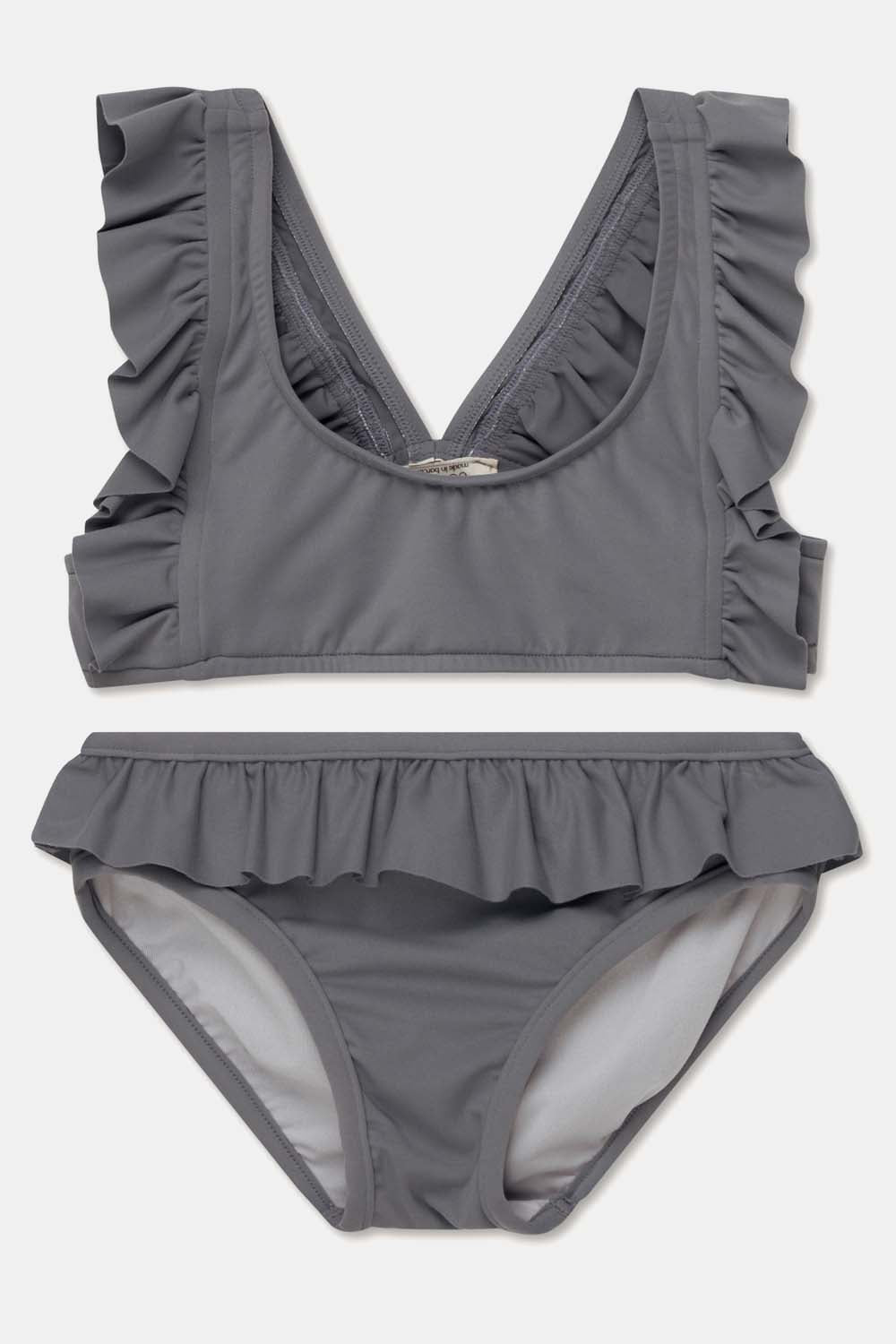 Your little one will always be ready to make a splash with this recycled two-pieces swimsuit. The bikini top has ruffled straps with a V-shape at the back, while the bottom features ruffles all the way around. This two-pieces swimsuit offers sun protection and dries super fast. Plus, it is gentle on both the skin and the environment. That is because it is made from plastic waste, mainly from recycled fishing nets that pollute our oceans and marine life. This two-pieces swimsuit is made in 78% GRS and OEOKOTEK-certified recycled polyamide and 22% elastane. Available in coral, yellow, green, grey, and taupe.