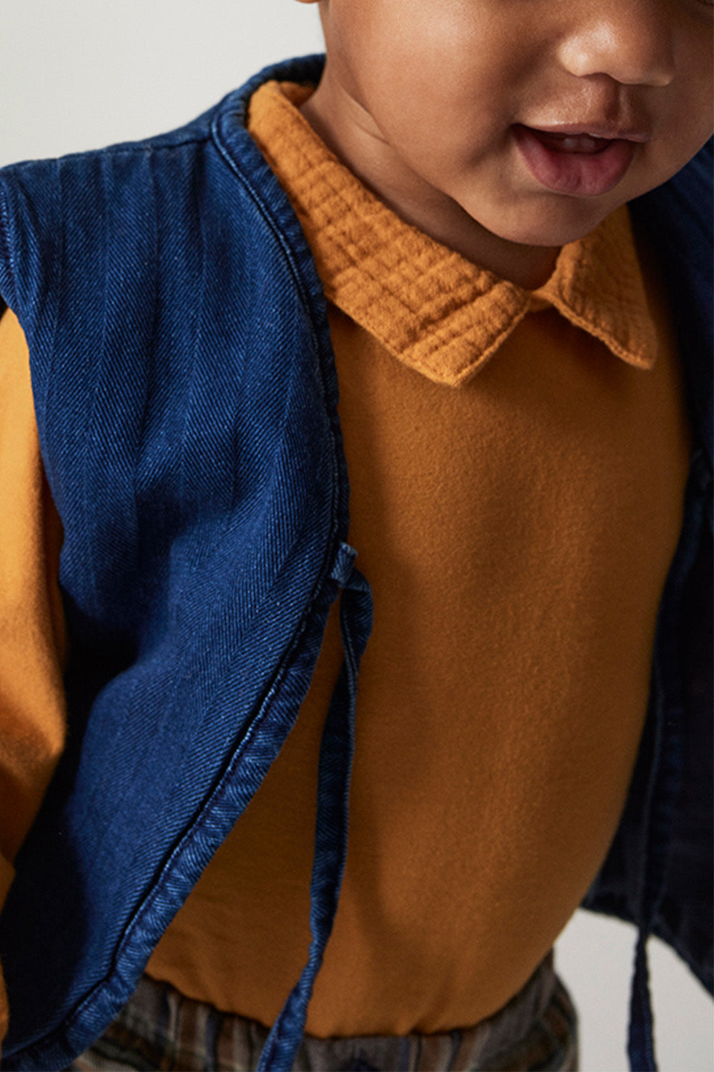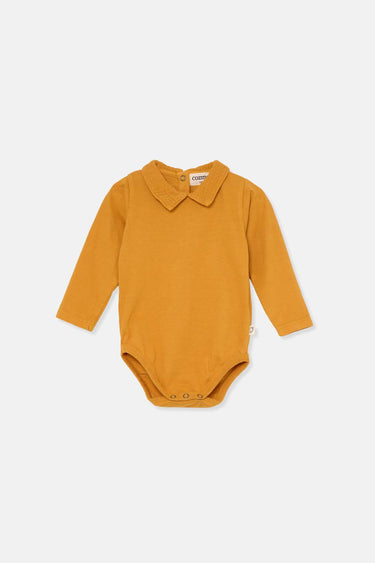 Peter Pan collar with a contrasting fabric. Long sleeves. Snap buttons at the back and gusset. Rib at leg openings.