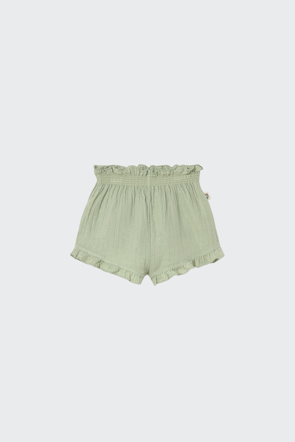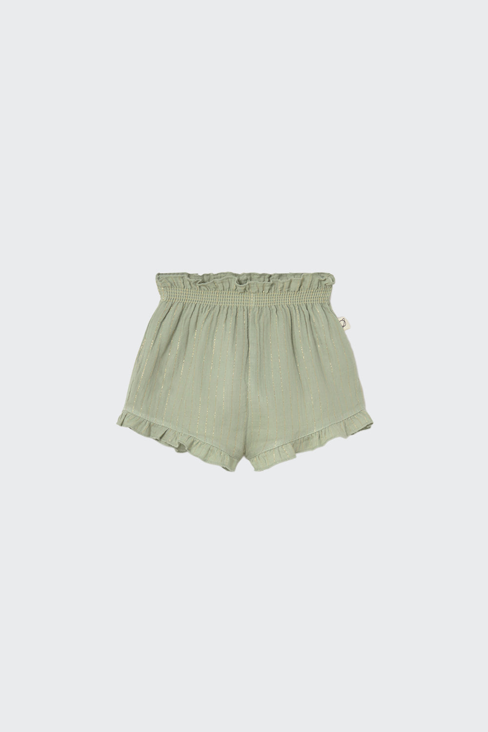 Get ready to twirl and shine! Our Gauze Baby Girl Shorts are the perfect addition to your little one's wardrobe. Made from soft, lightweight cotton gauze, these striped shorts will keep her cool and comfy while she explores the world around her. The smocked waistband stretches for a snug fit, adorned with adorable ruffle details that dance with every move. Plus, those shimmering stripes of golden lurex add just the right touch of sparkle for any occasion! Whether it’s a playdate at the park or a family gathering, these flowy shorts are bound to be a favorite. Pair them with her favorite top and let her personality shine through! Designed for babies and toddlers by Cozmo as part of our delightful gauze collection.