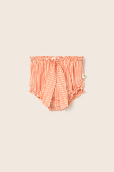 Baby girls’ striped bloomers made from cotton fabric with a linen-like texture. They feature a smocked waistband and leg openings, and a bow at the front.
