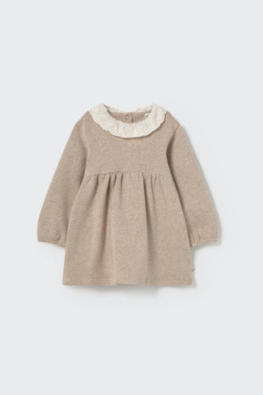 This baby dress is made from a buttery-soft knit, brushed inside and out for an extra warm finish. It features a frilled collar with delicate lace detailing and a button closure at the back for easy dressing. The front and back yoke add a classic touch, while long puffed sleeves with elastic cuffs offer comfort and gentle volume—perfect for keeping little ones cozy on cooler days.