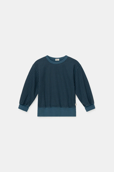 This organic sweatshirt, designed in a gingham plaid pattern, features a crew neck, and ribbed cuffs and hem. Made up of 100% organic cotton certified by GOTS. Designed in oil, blue and light grey.