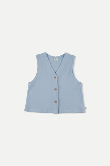 V-neck vest in soft, waffled, organic cotton vest. Buttons at front and straight hem. Super-soft inside for excellent wearing comfort. Garment-dyed. 100% organic cotton. Knit