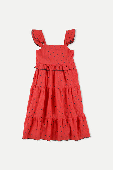 Dress in polka-dot-printed, airy, muslin organic cotton. Flounce-trimmed straps with buttons at the back. Tiers at midsection and skirt, and flounce at hem. Ruffles detail at midsection. Smocked back. Garment-dyed. 100% organic cotton. Woven