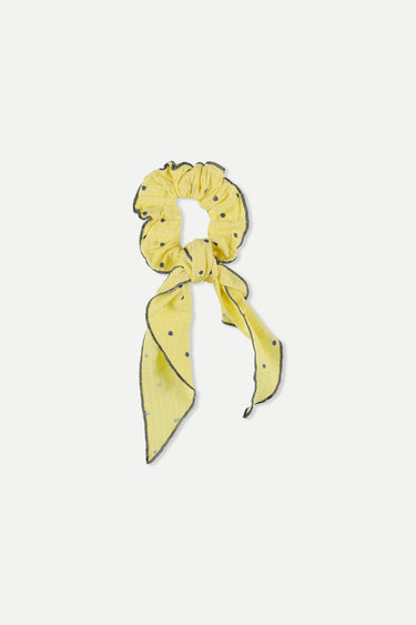 Elasticized scrunchie in polka-dot-printed, airy, muslin organic cotton. Scarf detail. Garment-dyed. 100% organic cotton. Woven