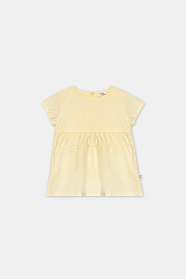 This light poplin dress has a round neck, short sleeves, a smocked waistband, and a button closure at the back.