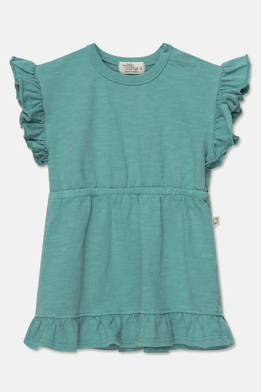 The perfect dress for everyday wear. Keep your little one comfy and super cute with this organic baby dress. It features ruffle detailing at sleeves and hem, a gathered elasticized waist, and a button opening at the shoulder. It is made in 100% GOTS-certified organic slub cotton. Available in coral, ivory, yellow, green, oil, and blue.