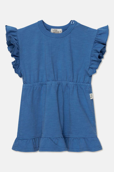 The perfect dress for everyday wear. Keep your little one comfy and super cute with this organic baby dress. It features ruffle detailing at sleeves and hem, a gathered elasticized waist, and a button opening at the shoulder. It is made in 100% GOTS-certified organic slub cotton. Available in coral, ivory, yellow, green, oil, and blue.