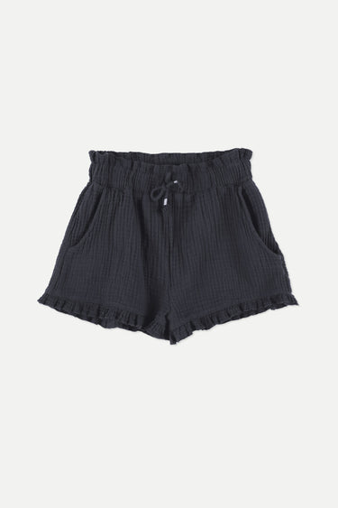 Shorts in soft, gauzy cotton. Elasticized waistband with decorative drawstring. Side pockets. Ruffle details at leg openings. Garment-dyed. 100% cotton. Woven