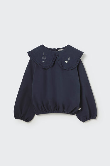 Part of Cozmo’s organic cotton kids clothes collection, this girls’ sweatshirt is crafted from premium brushed fleece for exceptional warmth and comfort. It features a Peter Pan collar made of textured fabric with a ruffled trim and embroidered musical details. The puffed long sleeves with elastic cuffs and an elastic hem provide a secure, cozy fit. A teardrop closure at the back adds an easy dressing detail. Smooth on the outside and soft, warm, and cozy inside, this sweatshirt is perfect for chilly days.