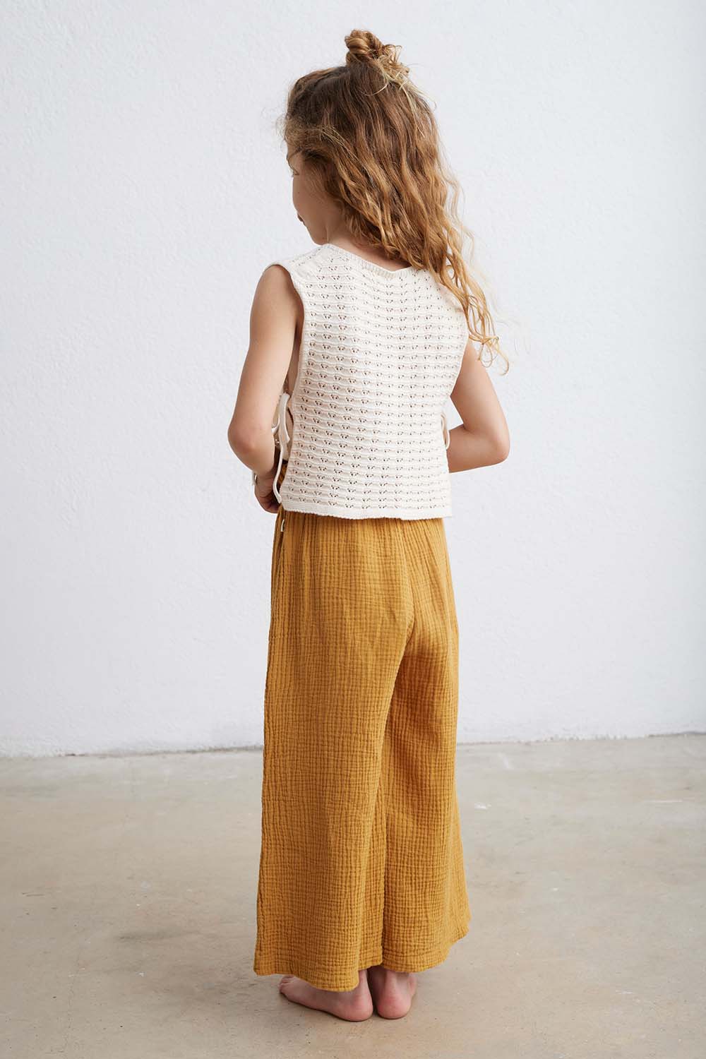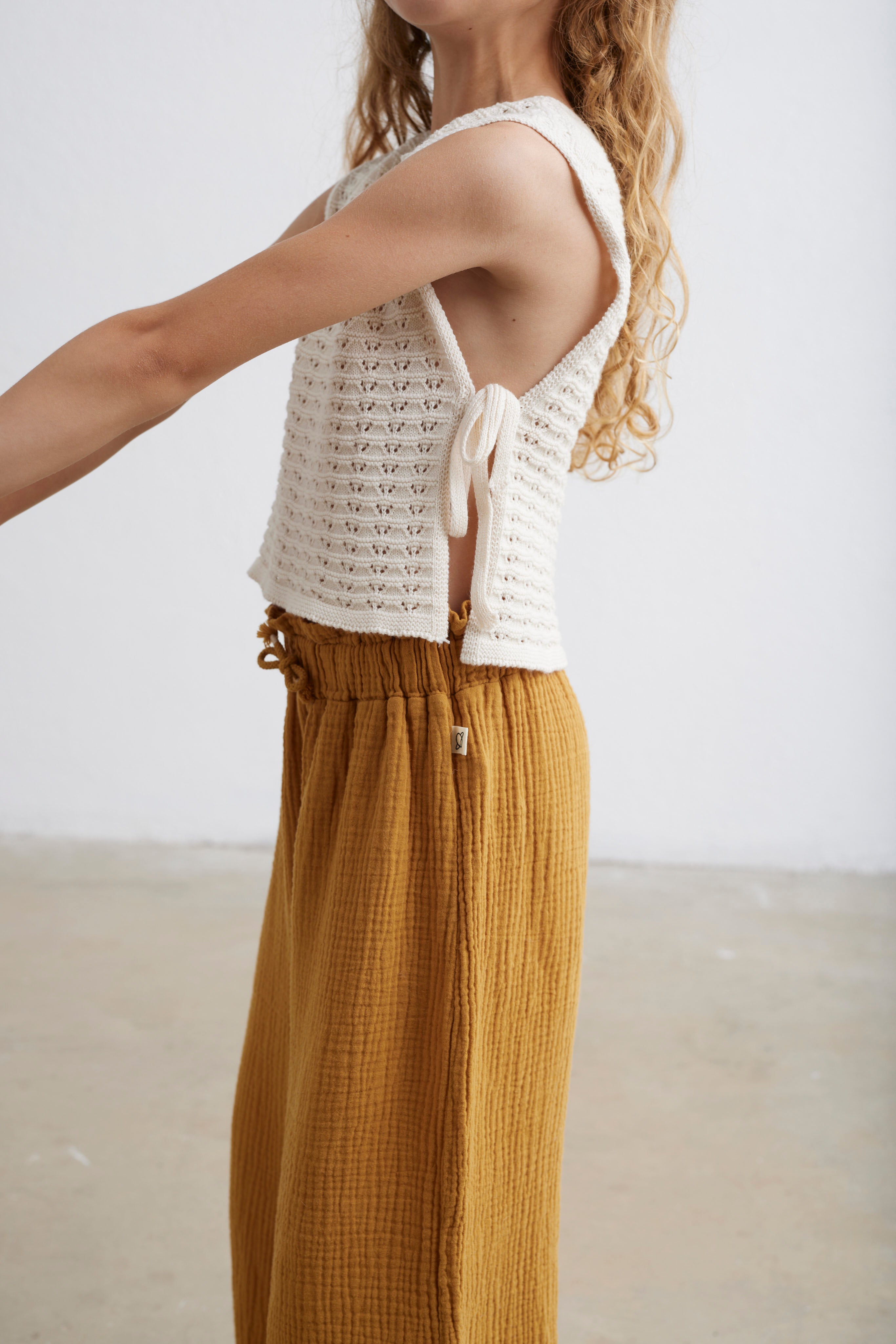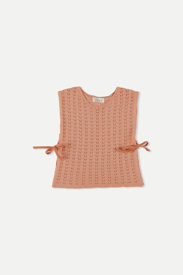 Top in a soft, comfy, crochet-look knit. Rounded neckline. Open at sides with ribbon fastening. Garment-dyed. 100% cotton. Knit