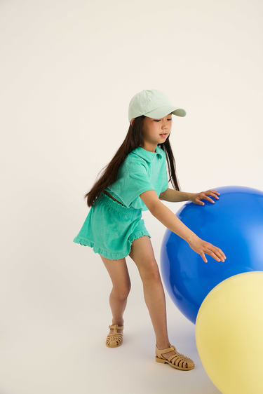 The elastic waistband ensures a snug fit, while the playful ruffles at the hems add a fun, girly touch that makes them stand out. Designed to pair perfectly with the matching toweling top, these shorts create a cute, coordinated look that’s perfect for any summer adventure.