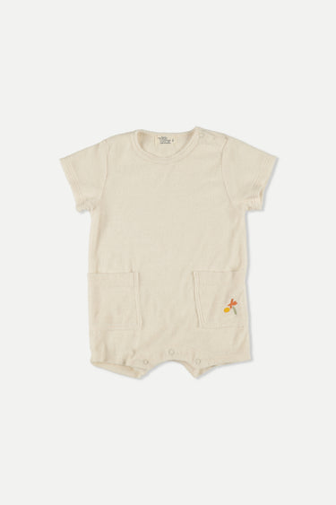 Jumpsuit in a fluffy, comfy, organic cotton towel fabric. Round neckline and snap button at the shoulder. Short sleeves. Two patch pockets at front. Snap buttons at gusset. Garment dyed. 85% organic cotton, 15% recycled polyester. Knit