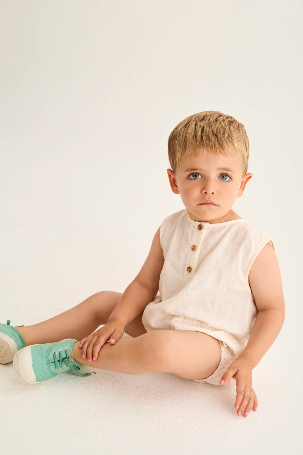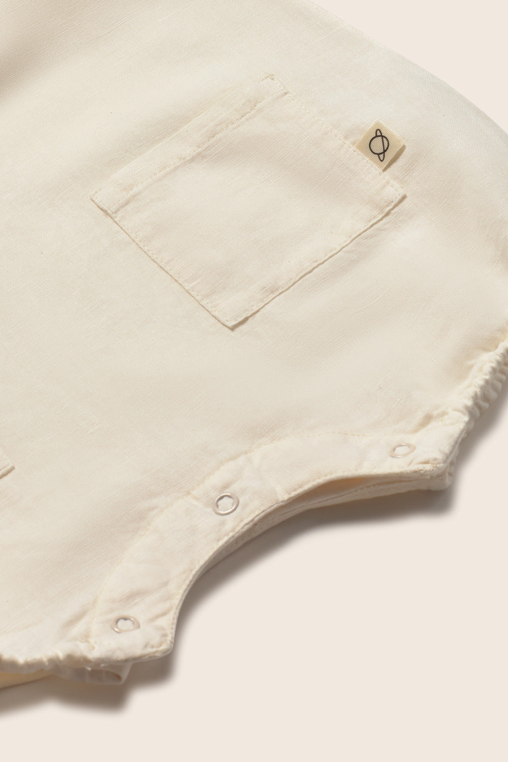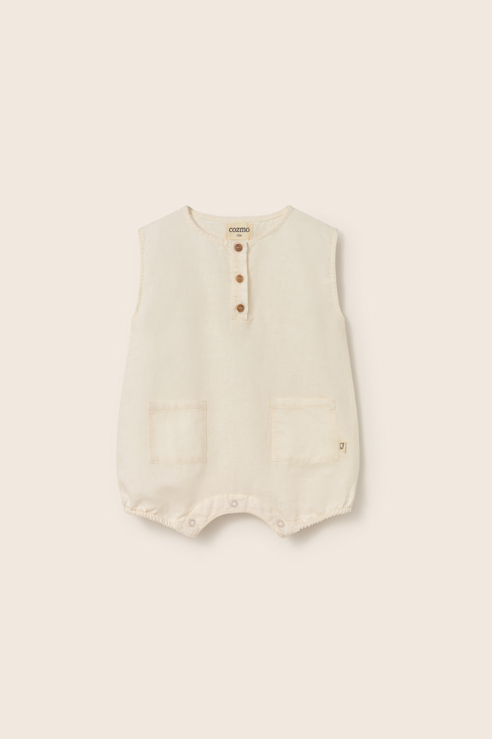 Baby romper made from a breathable cotton-linen blend. It features a round neckline, a front button placket, and a sleeveless design with short legs. Finished with front patch pockets and snap buttons at the gusset for easy dressing.