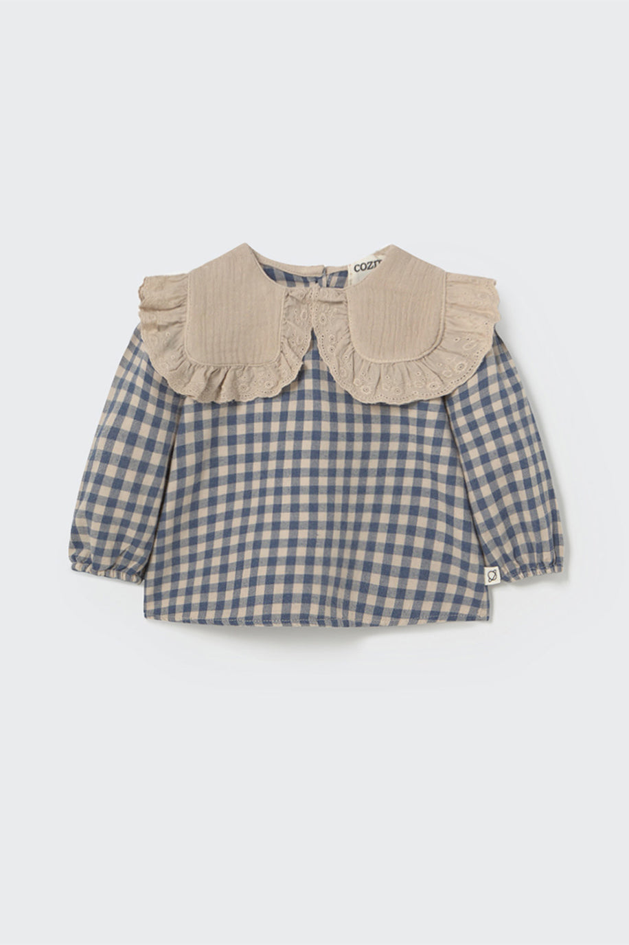 This baby girl’s blouse is made from soft, brushed flannel in a classic gingham plaid pattern, crafted from sustainable cotton. It features a squared Peter Pan collar in contrasting textured fabric with a lace trim detail. The button-front design allows for easy dressing, while puffed sleeves with elastic cuffs provide a comfortable fit. The warm, smooth fabric makes it perfect for cooler days.