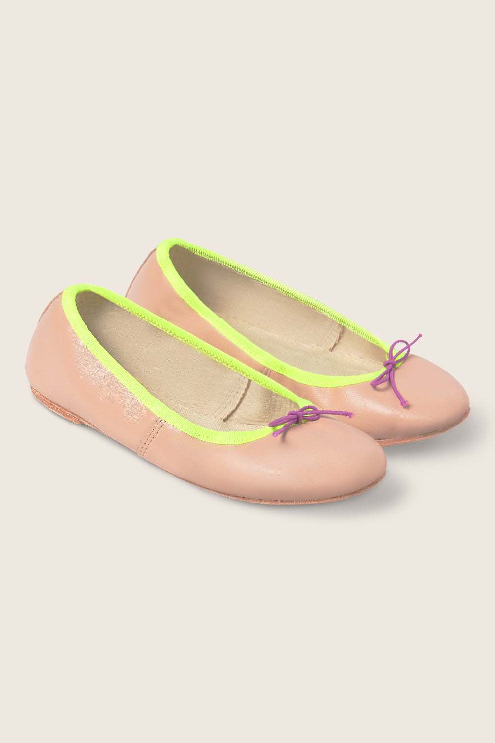 Girls’ ballet flats handcrafted in Spain in a nude color. Featuring contrasting yellow neon binding and a purple bow at the front for a playful touch.