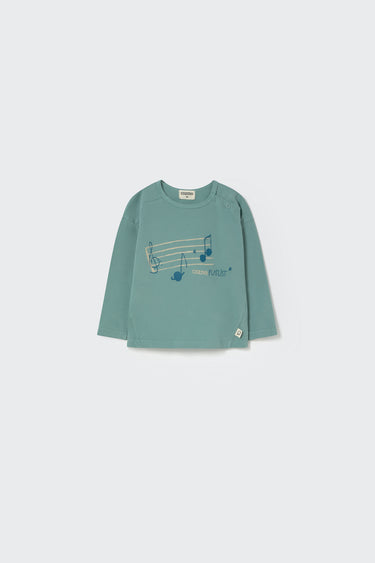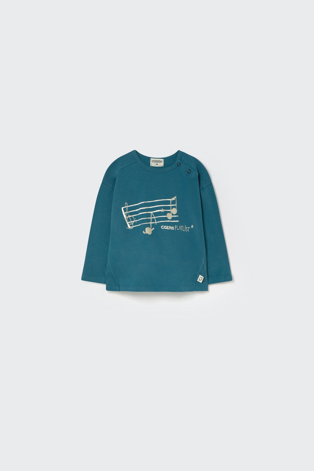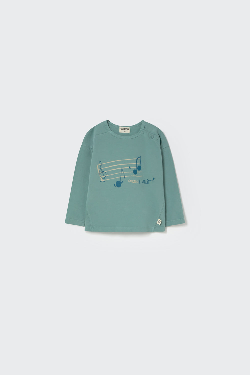 This baby T-shirt is part of our organic cotton baby clothes collection, made from toasty jersey fabric. It features a round neckline with snap buttons at the shoulder, dropped shoulders, long sleeves, and a triangle insert at the sides. The front shows a graphic print with a musical staff, notes, and the message "Cozmo Playlist." Brushed on the outside for a soft, comforting feel.