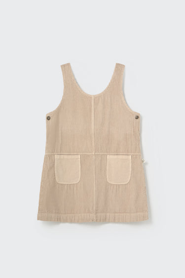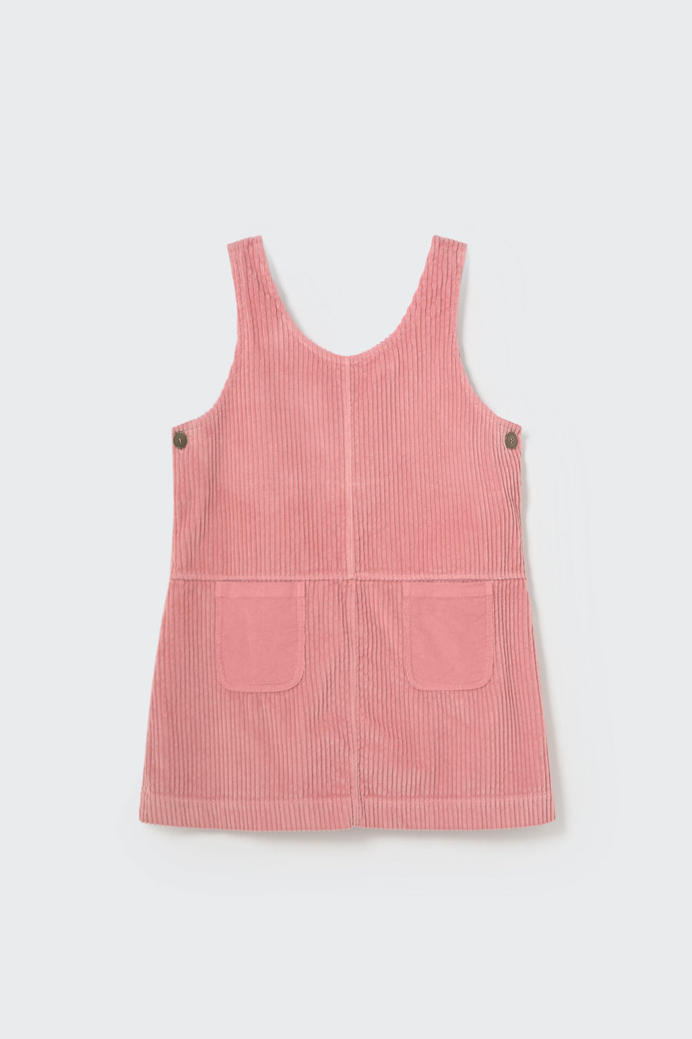 Super soft and cozy wide corduroy dress made from OCS and OEKO-TEX certified organic cotton. It features a rounded neckline, side openings with buttons, central and horizontal seams, and patch pockets at the front. Details in contrasting corduroy fabrics and lining in signature 'Cozmo' fabric complete the design. Gentle to the touch and pleasantly snug, perfect for girls.