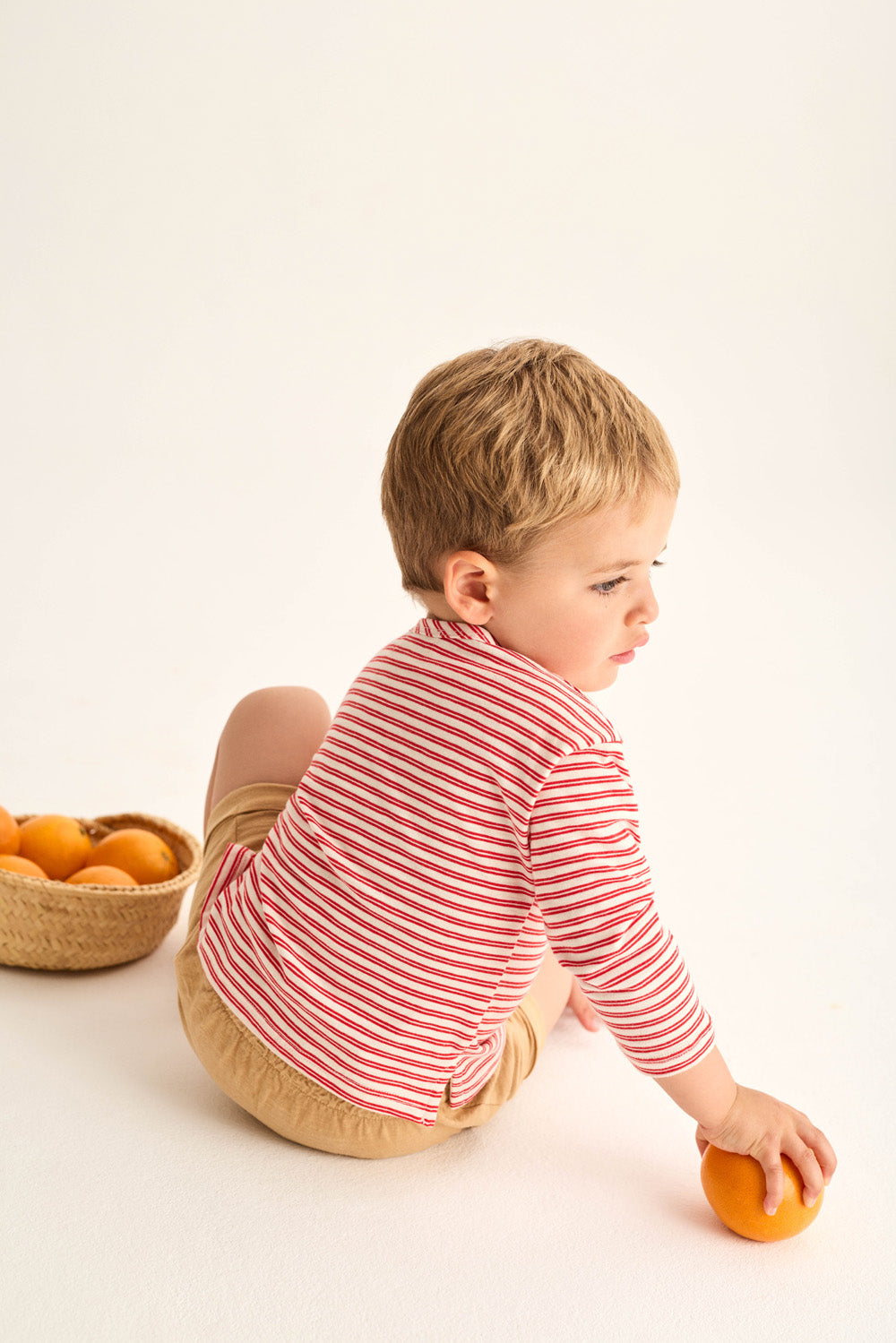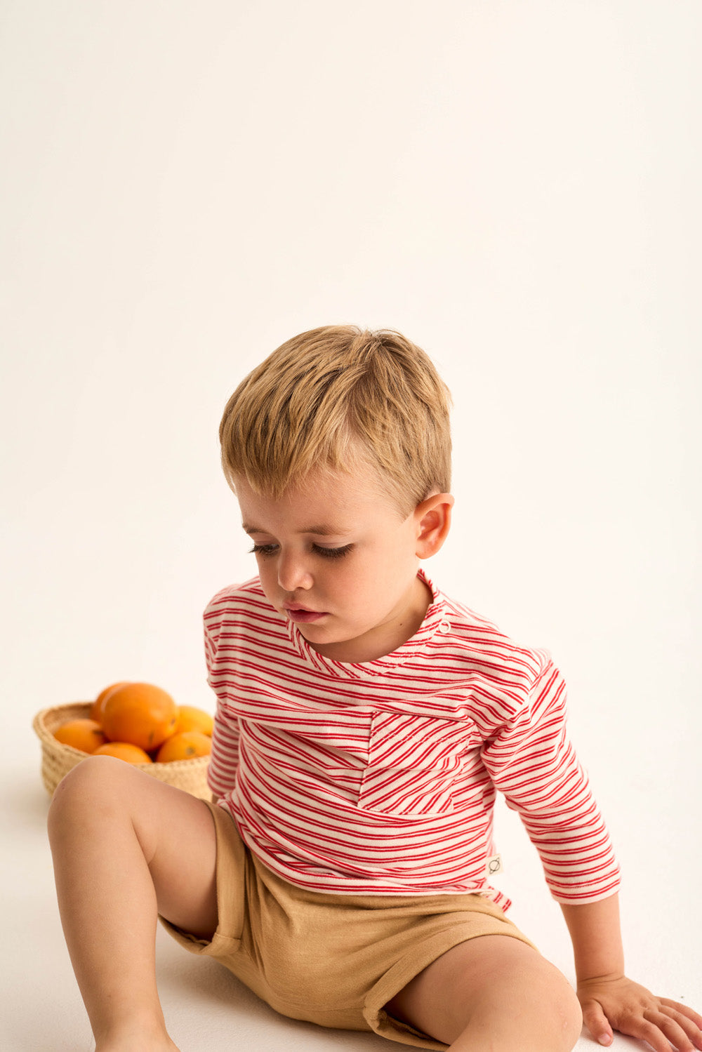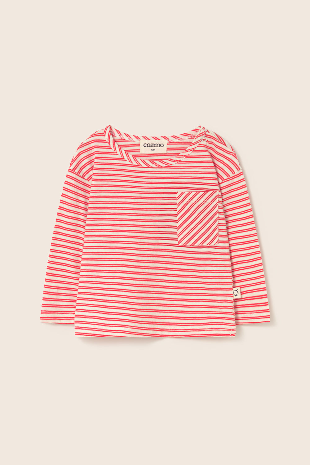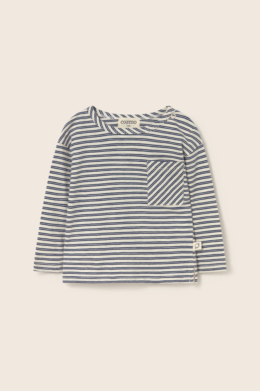 Baby and toddler striped T-shirt made from super breathable slub cotton. It features a round neckline, dropped shoulders with long sleeves, a bias-cut patch pocket on the chest, and side slits for a comfortable, easy-to-wear fit.