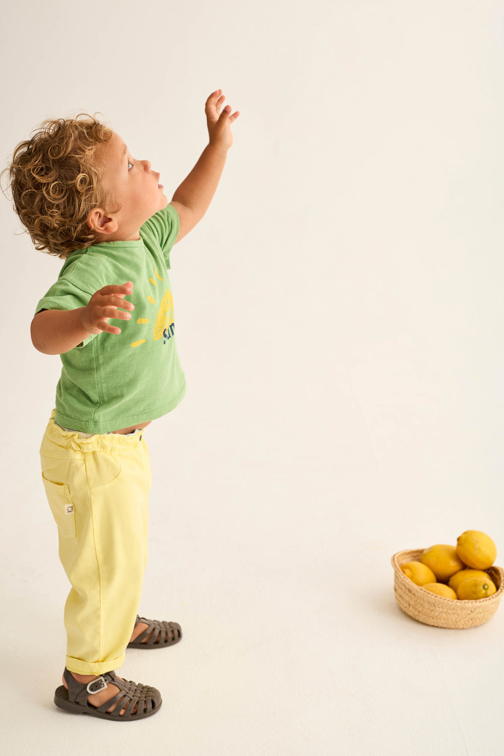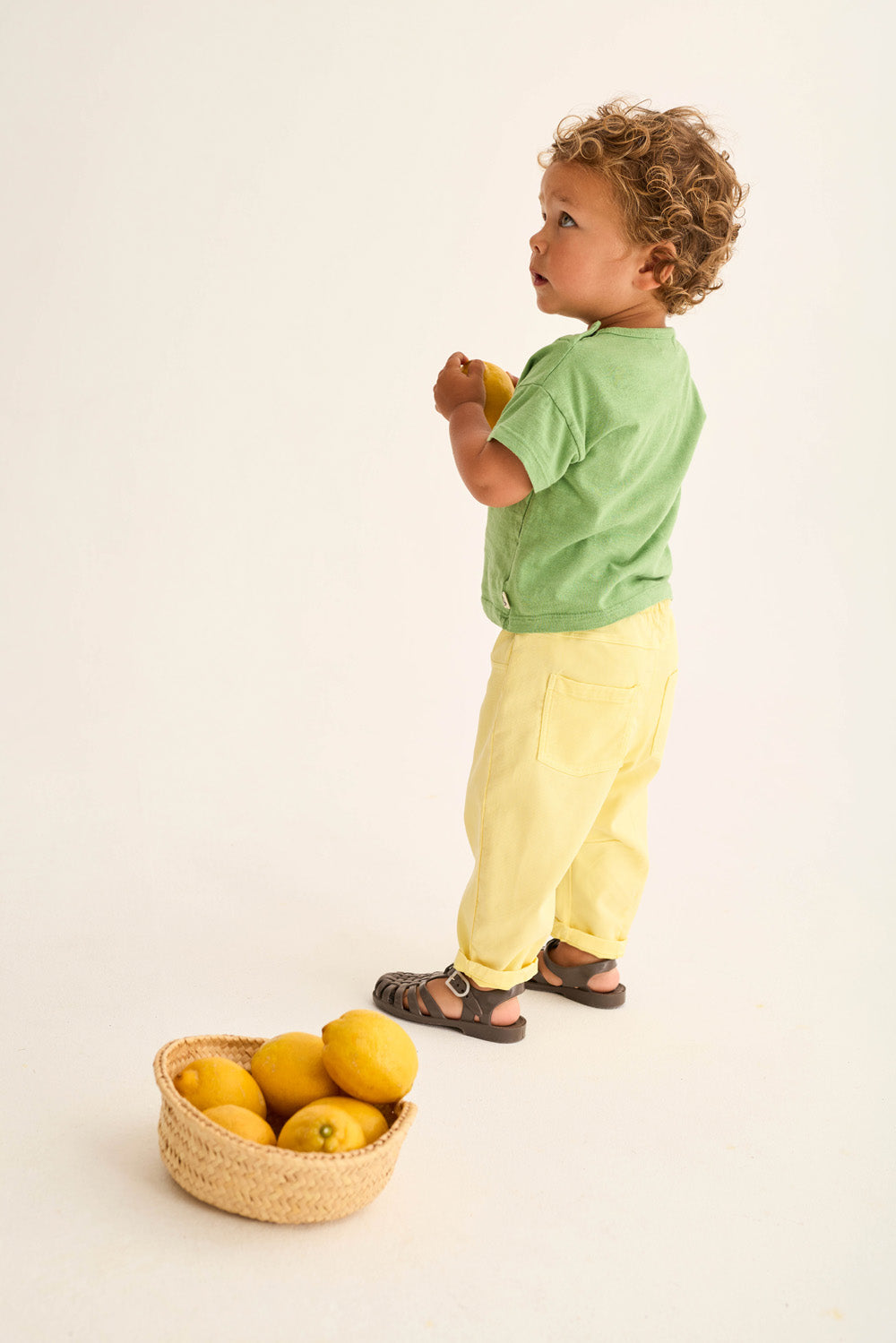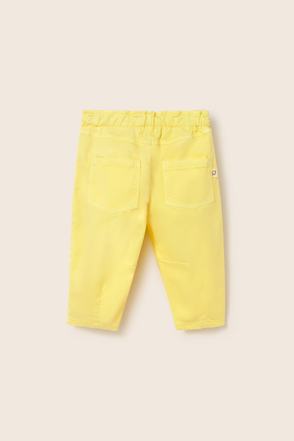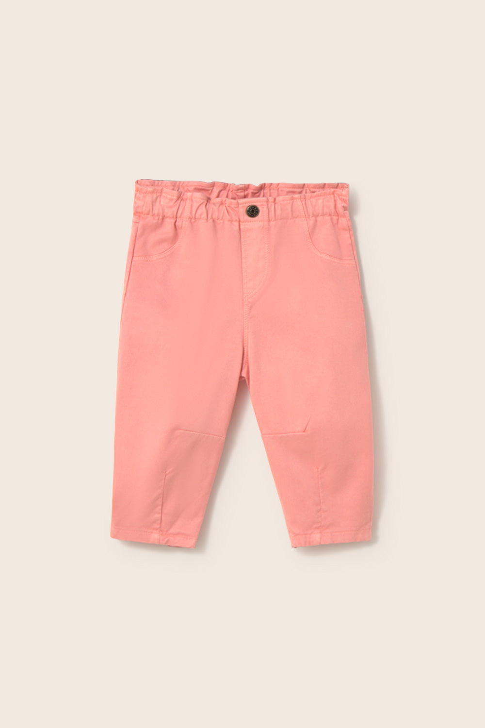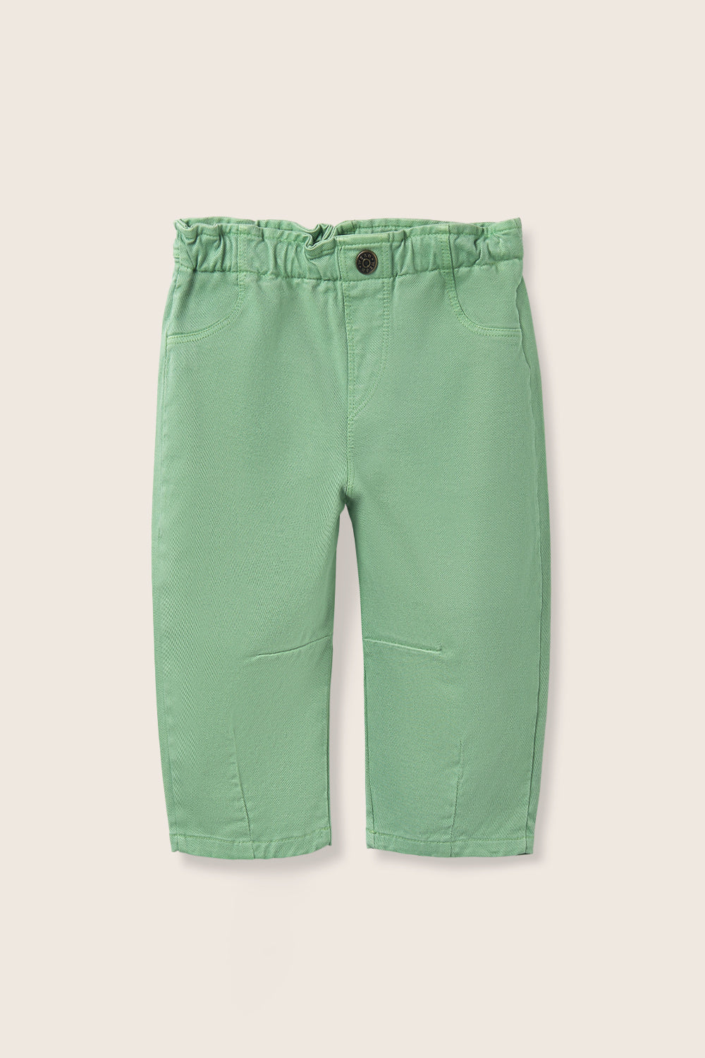 Baby and toddler pants made from comfy, elastic cotton twill. They feature an elastic adjustable waistband, a decorative button with a mock fly, a back yoke, fake front pockets, two back patch pockets, and creases at the front and back for a polished, classic look.