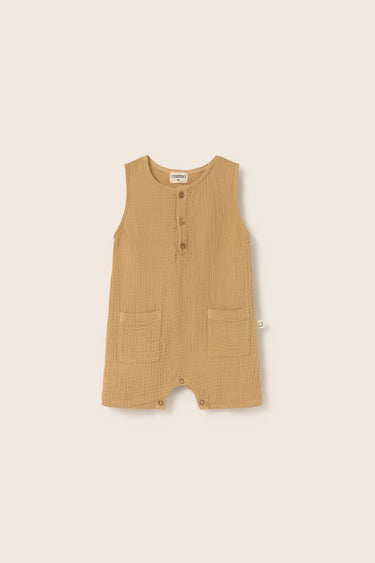Mono para bebé y niño pequeño en algodón de gasa. Presenta cuello redondo, diseño sin mangas con pierna corta, tapeta de botones a presión en el delantero, dos bolsillos de parche en las piernas y botones a presión a lo largo de las piernas para facilitar el cambio.