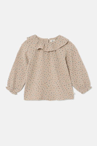 Blusa de gasa suave con estampado floral Liberty. Cuello redondo con volante redondeado sobrehilado. Mangas largas raglán con puños elásticos. Cierre de lágrima en la espalda. Efecto arrugado. 100 % algodón. Tejido