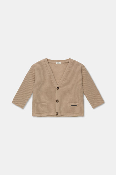 Este cárdigan de punto tricot está compuesto de 32% lana, 32% nailon, 30% viscosa, 3% cachemira y 3% otras fibras.